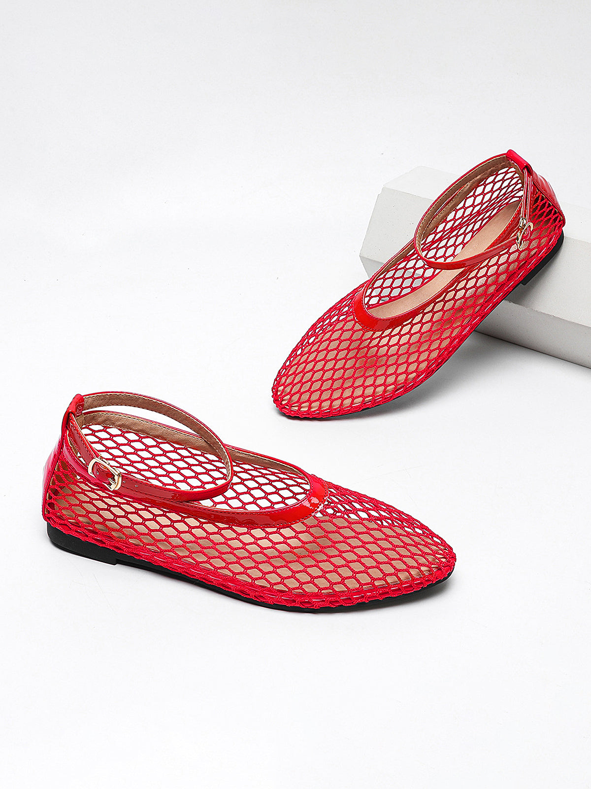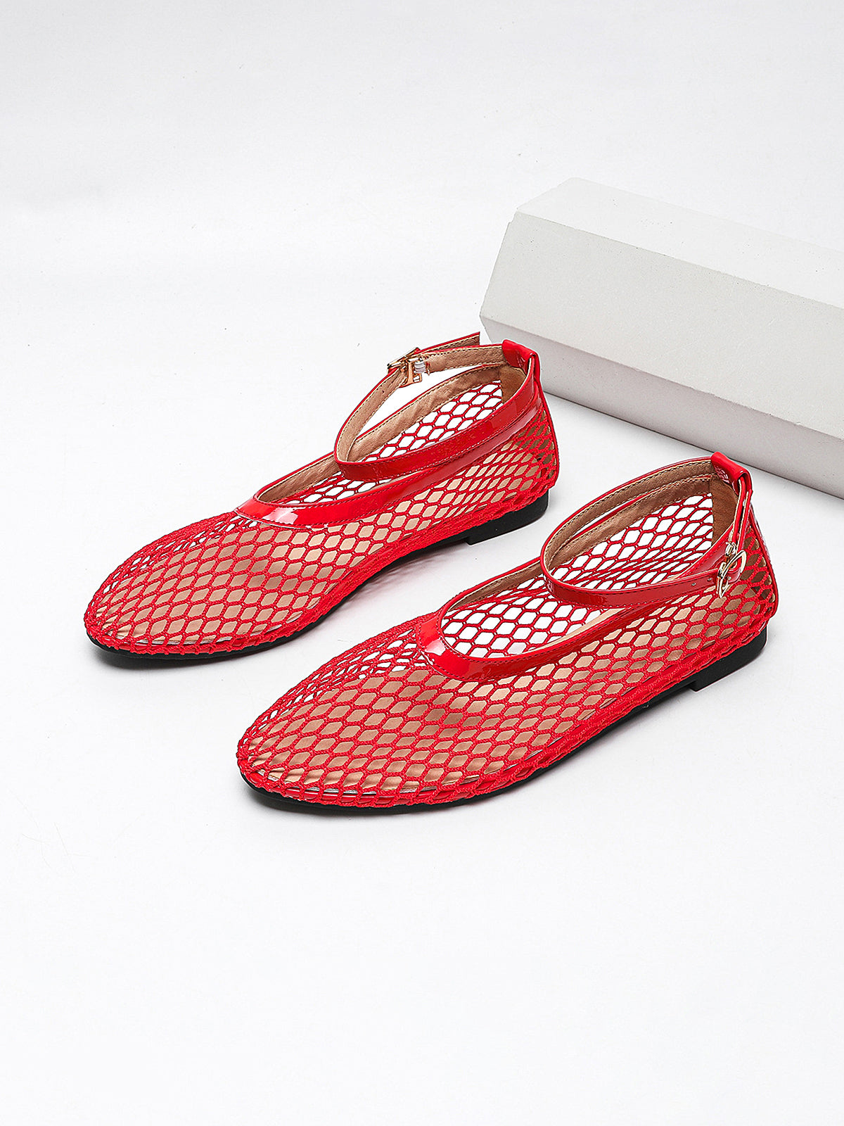 Fishnet Mesh Ankle Strap Ballet Flats