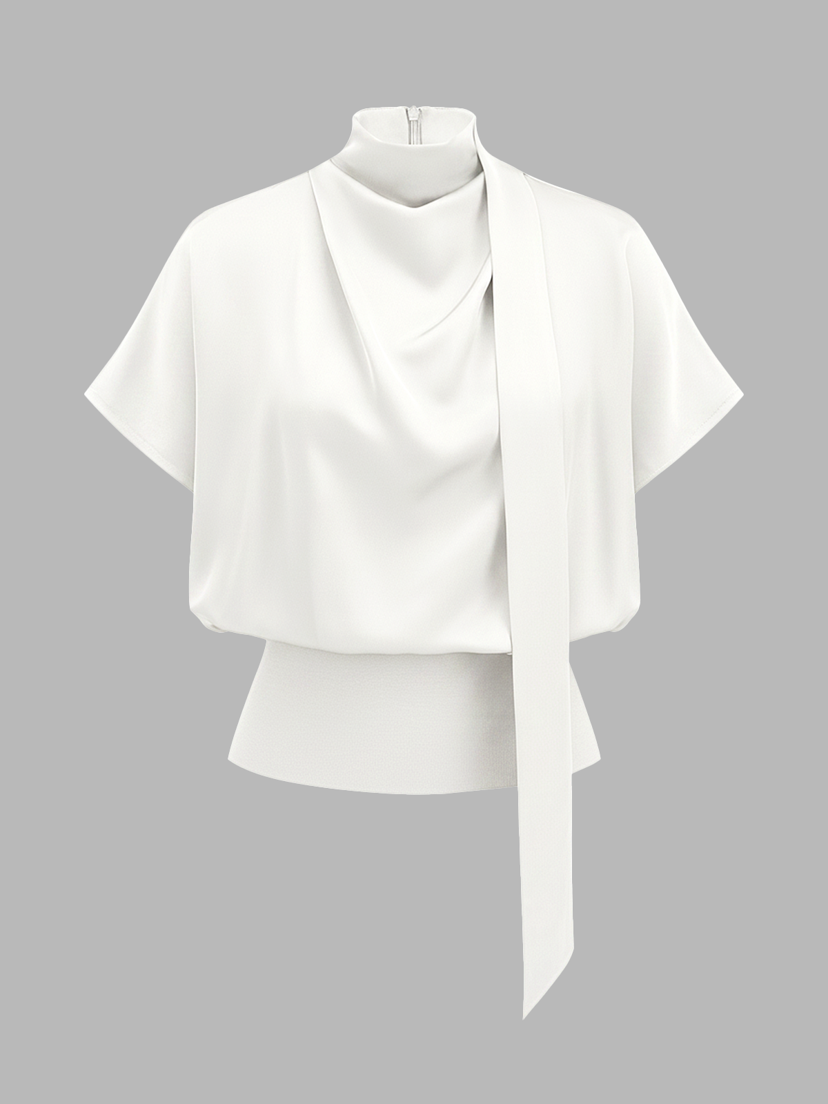 Draped Satin Mock Neck Blouse with Tie