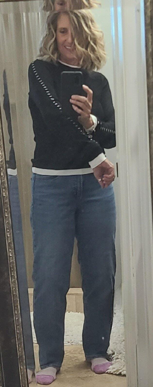 I love this top. It fits great and is not too heavy for Florida winters. The material is quality. The stitching adds a nice look and the mock layered white adds a splash of color.