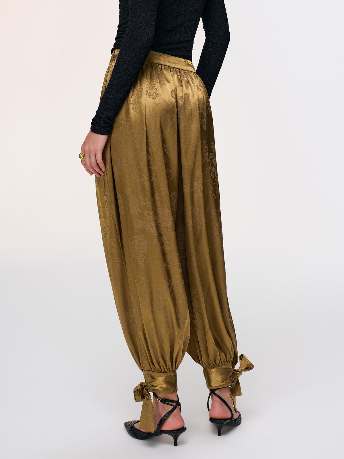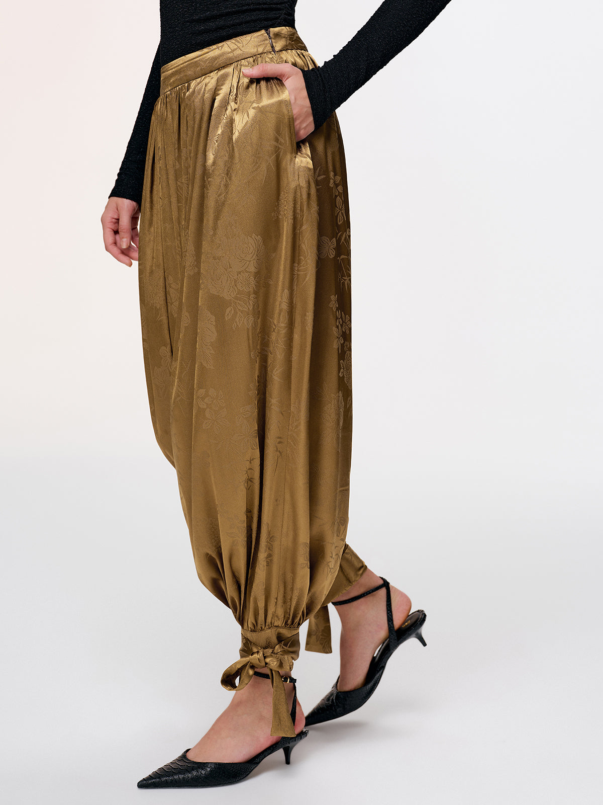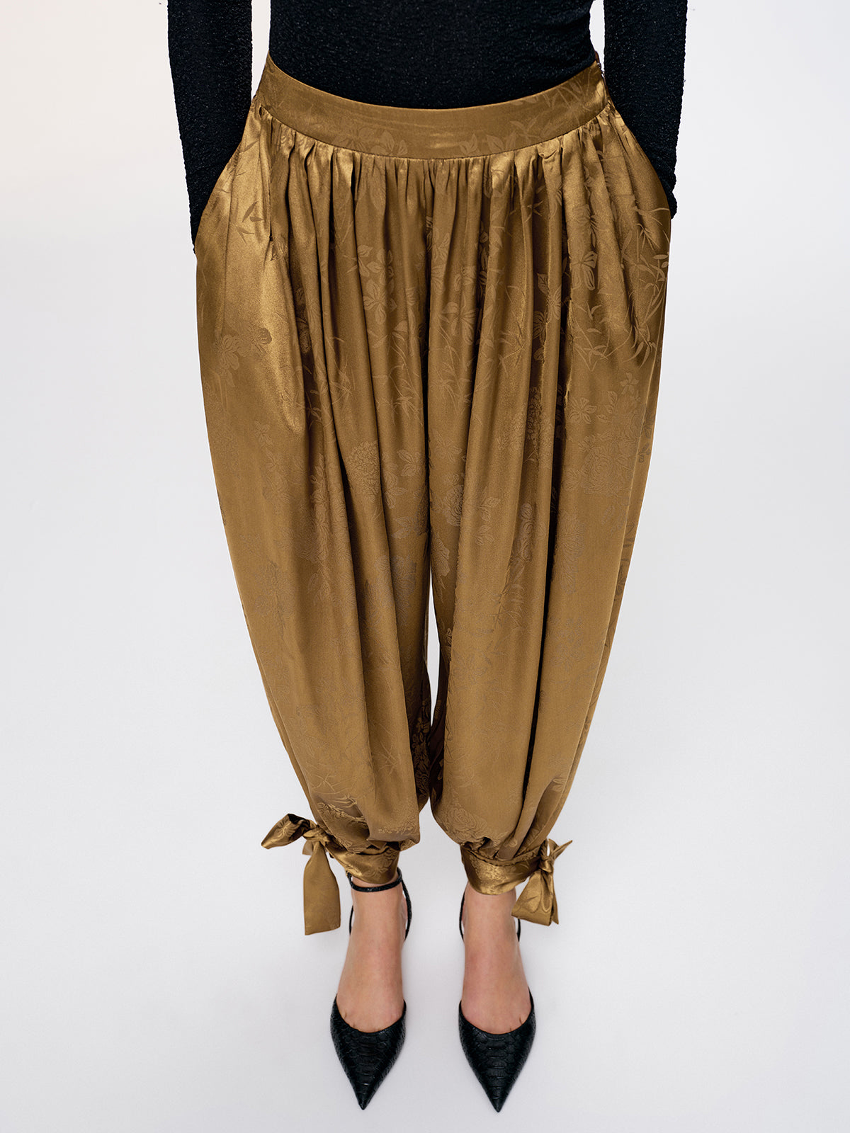 Tie-Cuff Satin Brocade Harem Pants