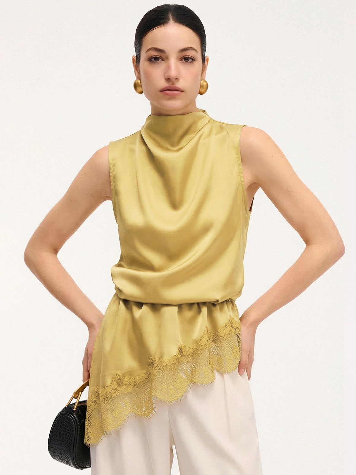 black,bloused waist,blouses,casual,clothing,coll:blouses_shirts,coll:tops,cowl neck,date,feminine,green,in_six_month,lace,mwt,mwt-ss,no,non-stretch,not_low_sales,oa251121051,photo_model,regular,regular fit,satin,season of love,sleeveless,summer hues,tops,women,yellow