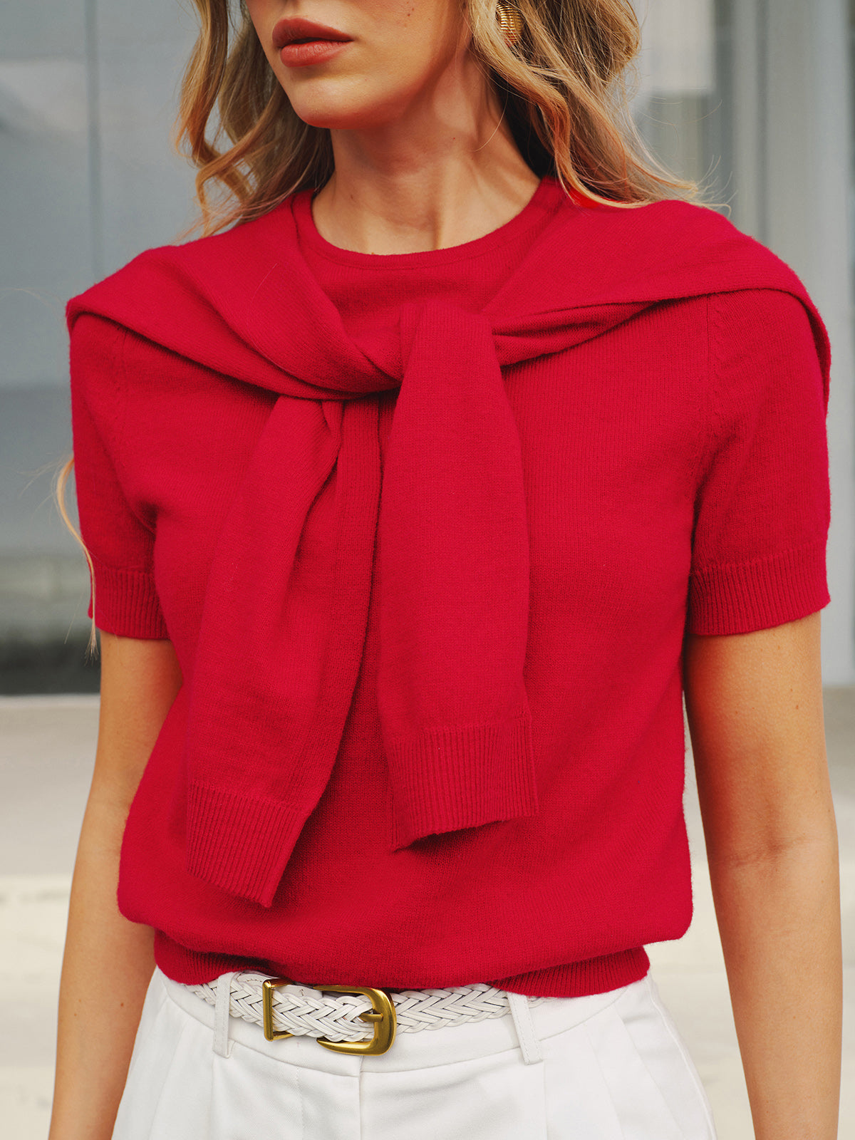 Wool Blend Scarf Detail Knit Short Sleeve Top