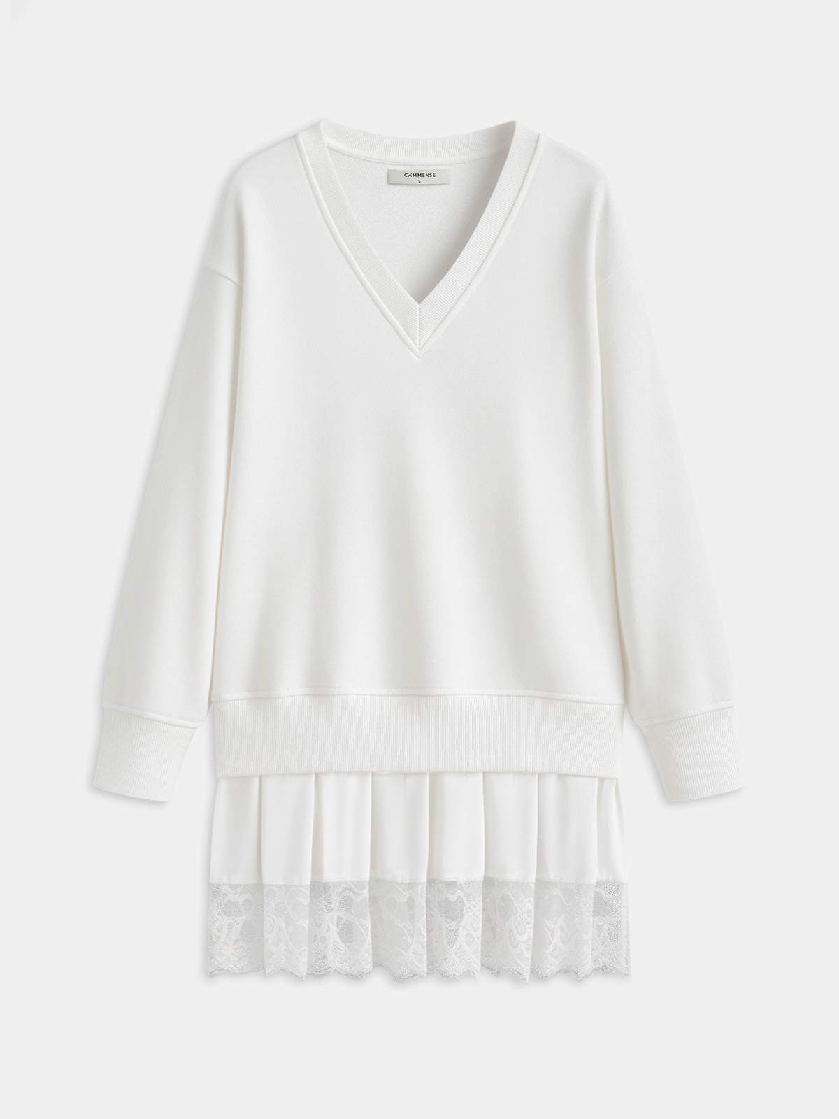 Pleated Hem Lace-Trimmed Sweatshirt Dress