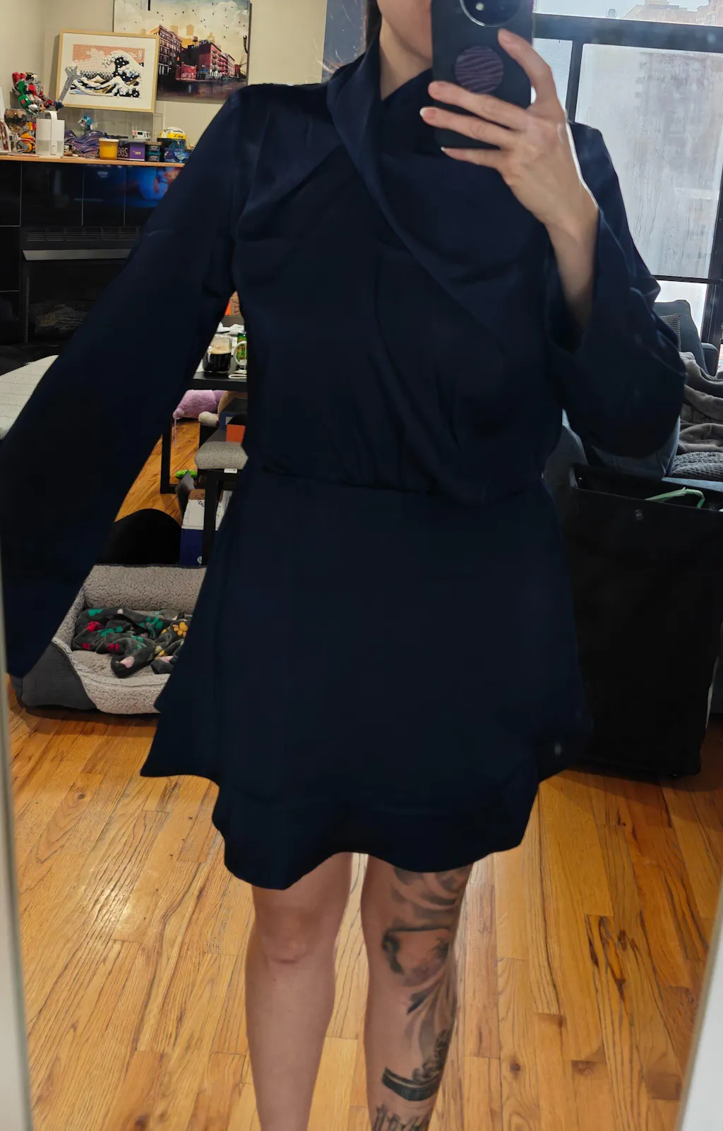 Long Sleeve Cross Neck Satin Tiered Mini Dress