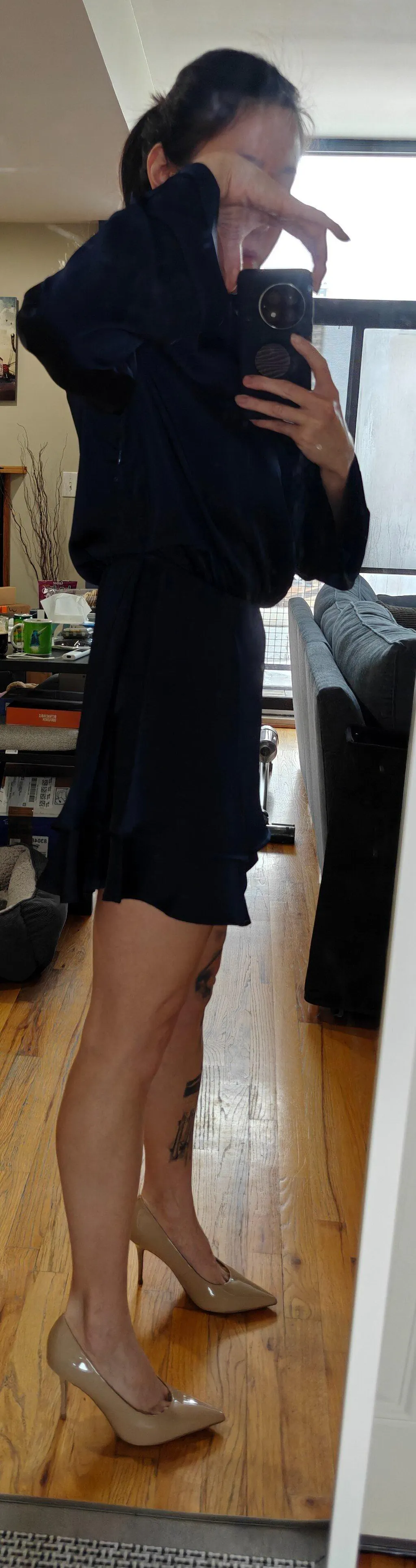 This navy dress is flattering and a beautiful colour. It is just a little too short for me at 5ft 7in.