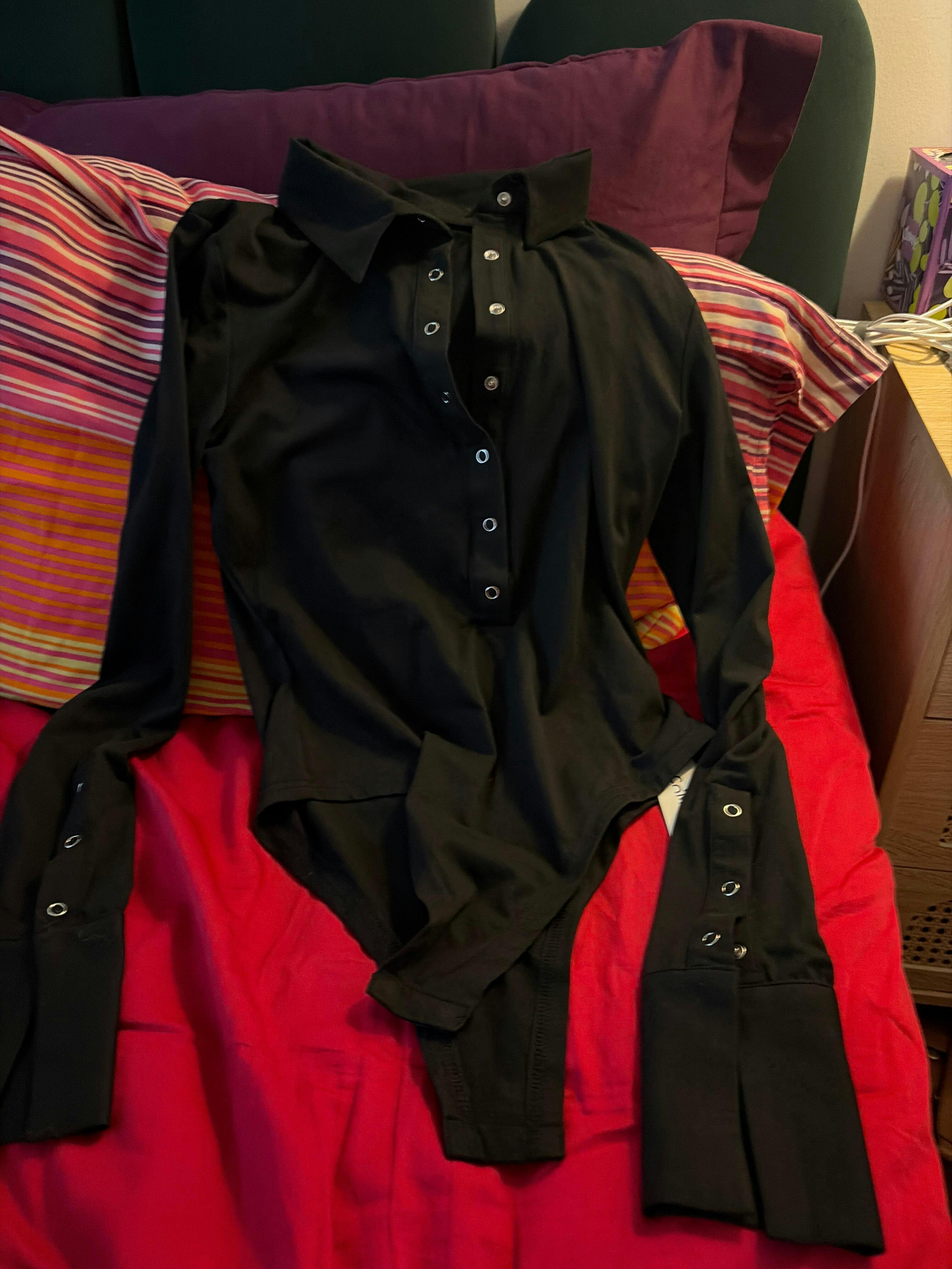 Body suit is amazing! V sexy,, nice soft material. Sleeve comes long over the hand which I like,, it sorta bells out,great detail w the snaps. It’s a spandex material thick & soft. It can be dressed up w leather pants & boot or can be dressed dwn w/distressed beaten up Levi’s.