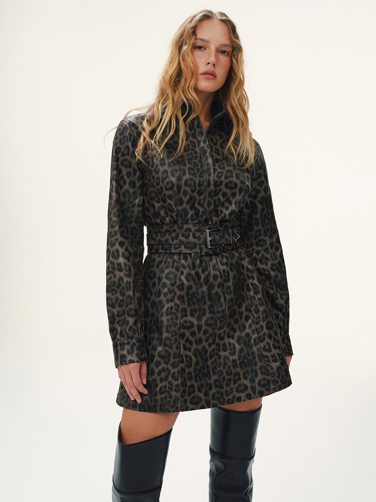 a-none,animal print,belted,clothing,coll:dresses,collar,dark brown,dresses,fall,in_six_month,inner sample,long sleeve,minegence,no,non-stretch,not_low_sales,oa250905031,photo_model,regular,short,slim fit,winter,women,woven fabric