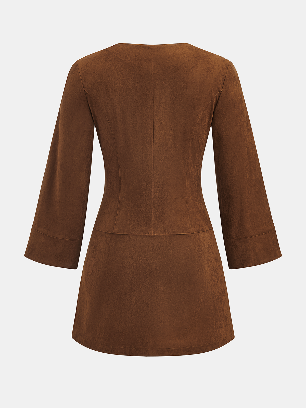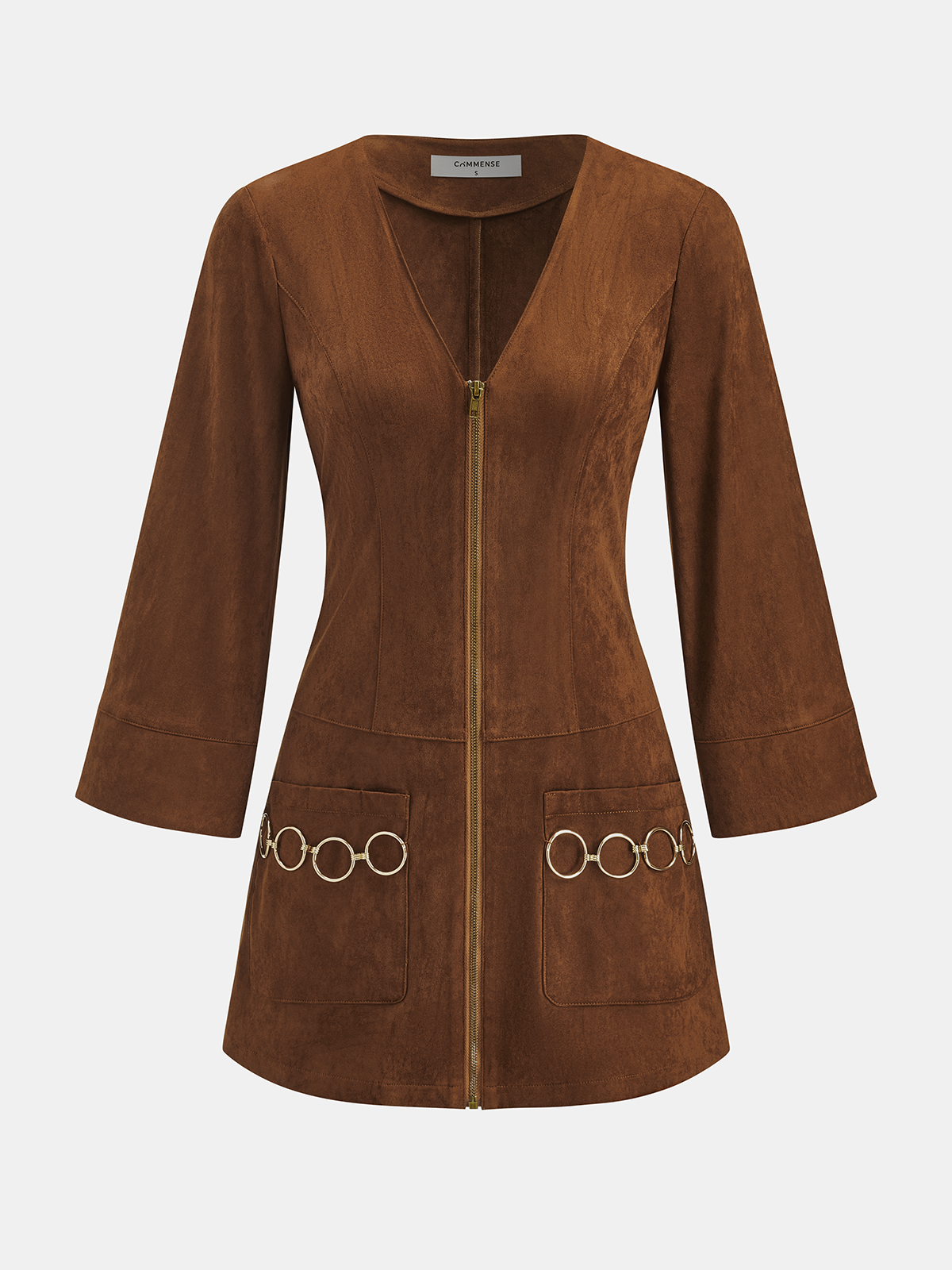 3/4 length sleeve,bohemian,brown,casual,clothing,coll:dresses,coll:trending,coll:vintage_fabrics,date,dresses,in_six_month,metal detail,minegence,no,not_low_sales,oa251113046,photo_ai,regular,regular fit,short,slight stretch,suede effect,v-neck,winter hues,women