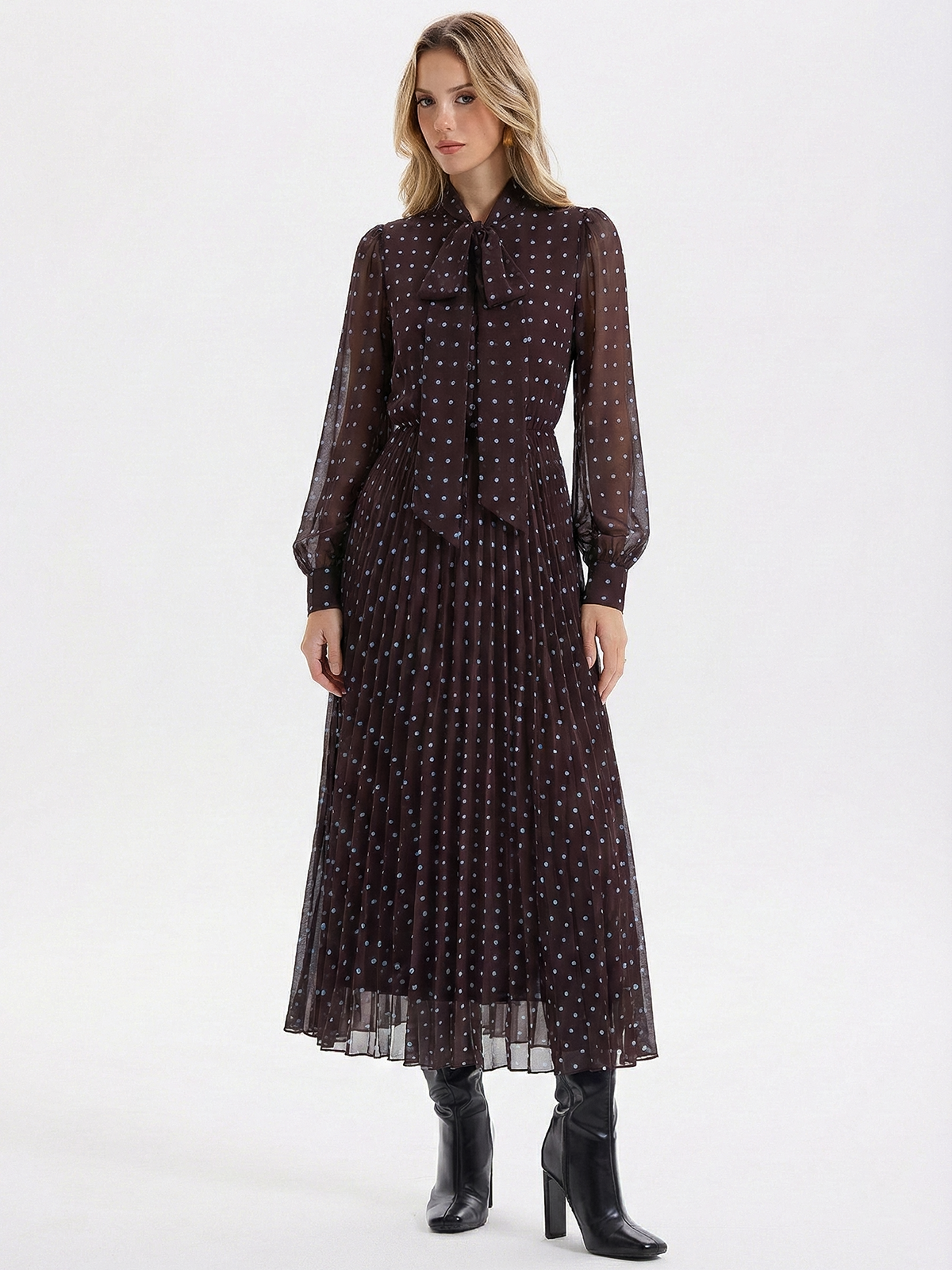 Tie-Neck Pleated Polka Dot Chiffon Maxi Dress