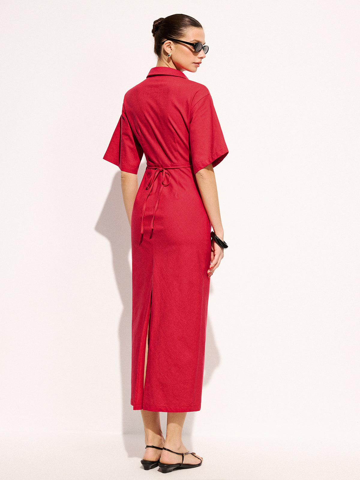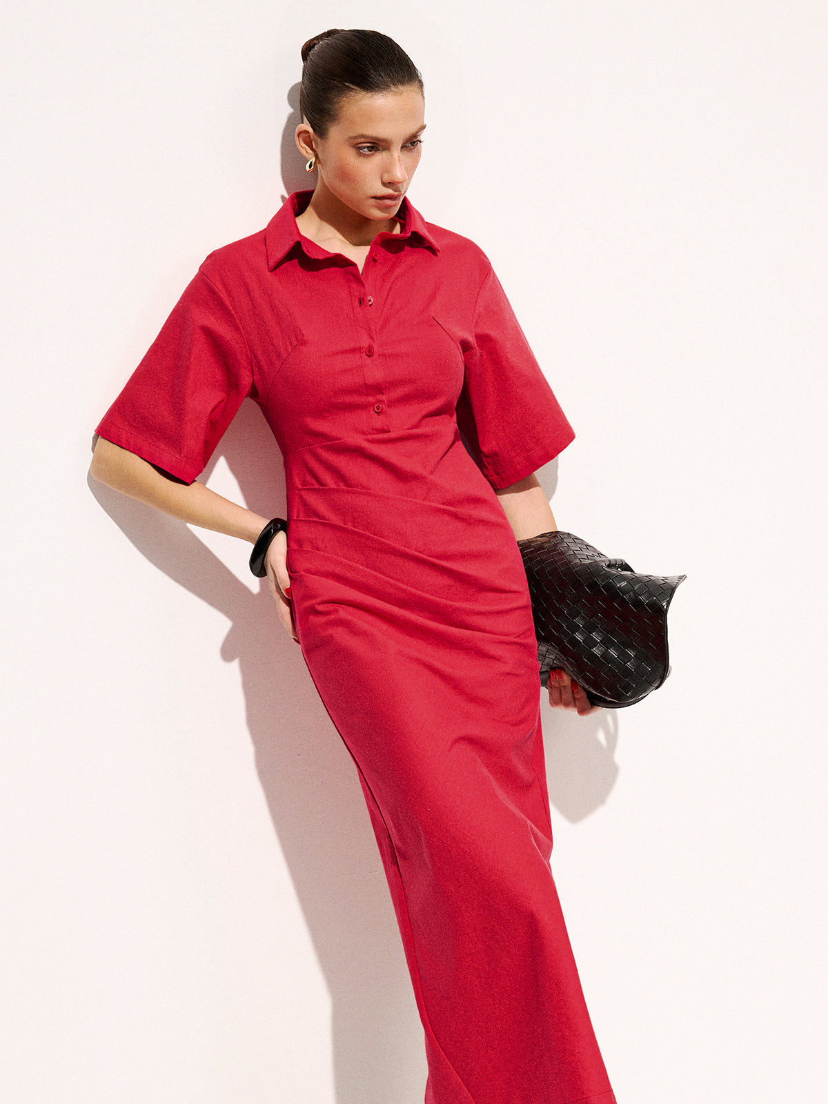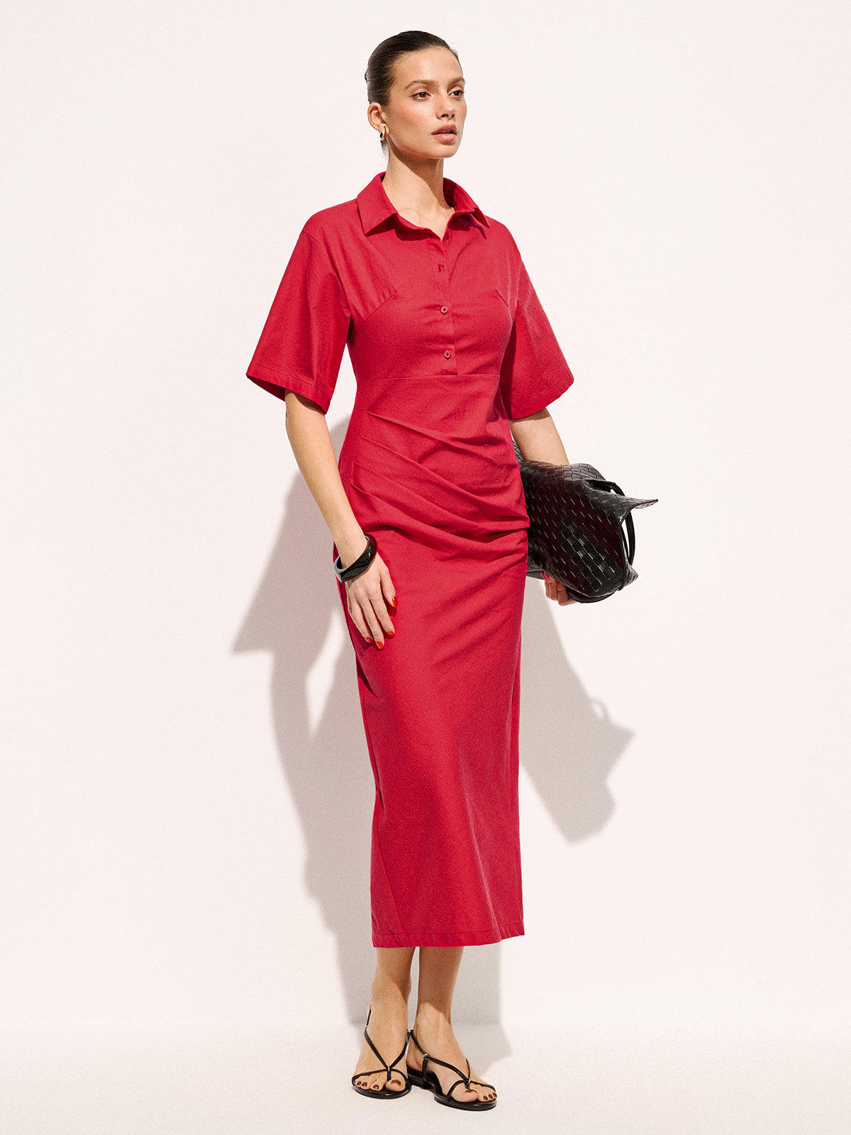 asymmetric,clothing,coll:dresses,coll:linen_cotton,coll:vacation,coll:weekend_getaway,collar,cotton,date,dresses,in_six_month,midi,minegence,no,not_low_sales,oa251224056,photo_model,pleated,red,regular,regular fit,short sleeve,slight stretch,summer hues,vacation,women