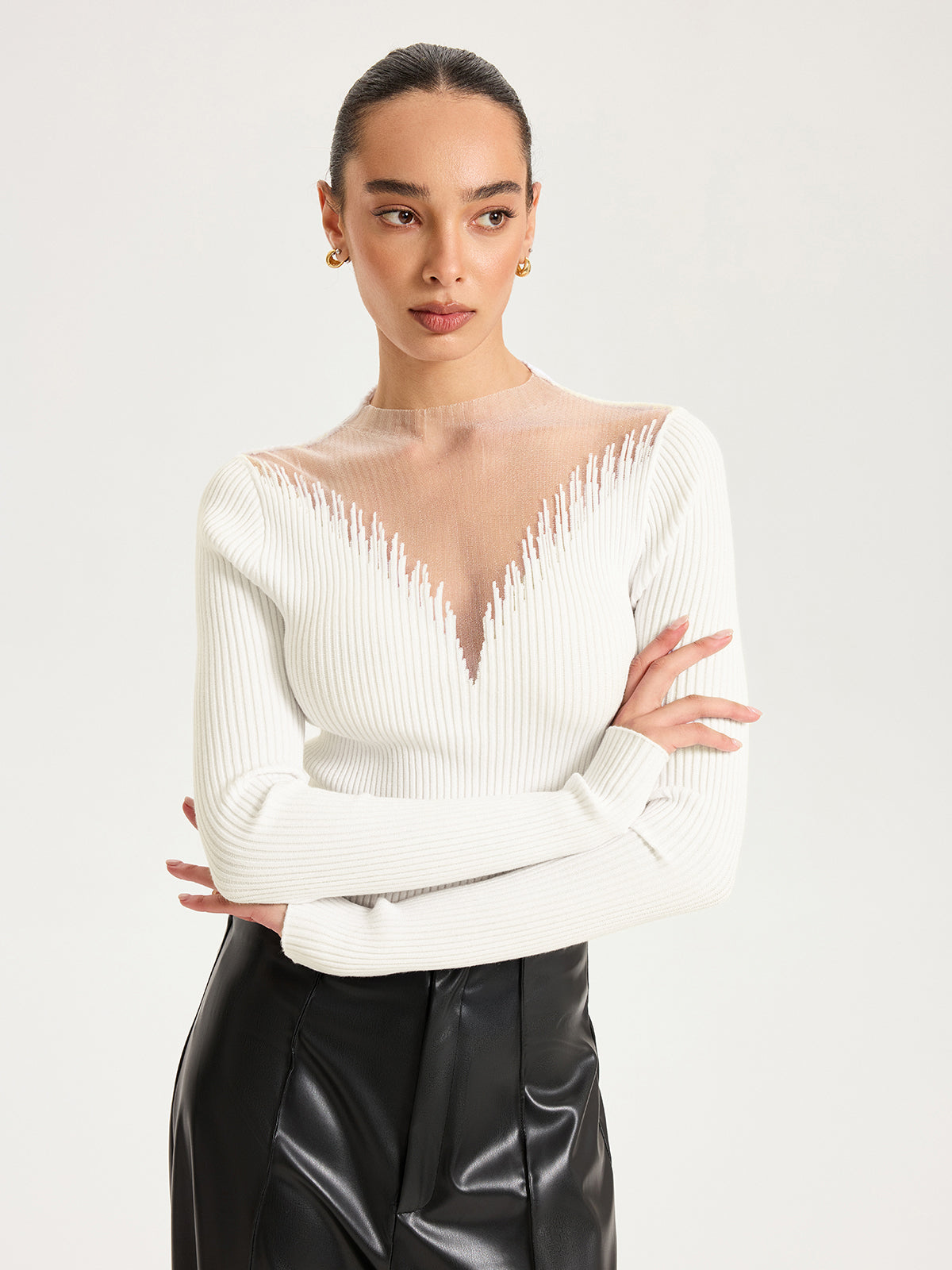 Sheer Mesh Panel Ribbed Knit Top