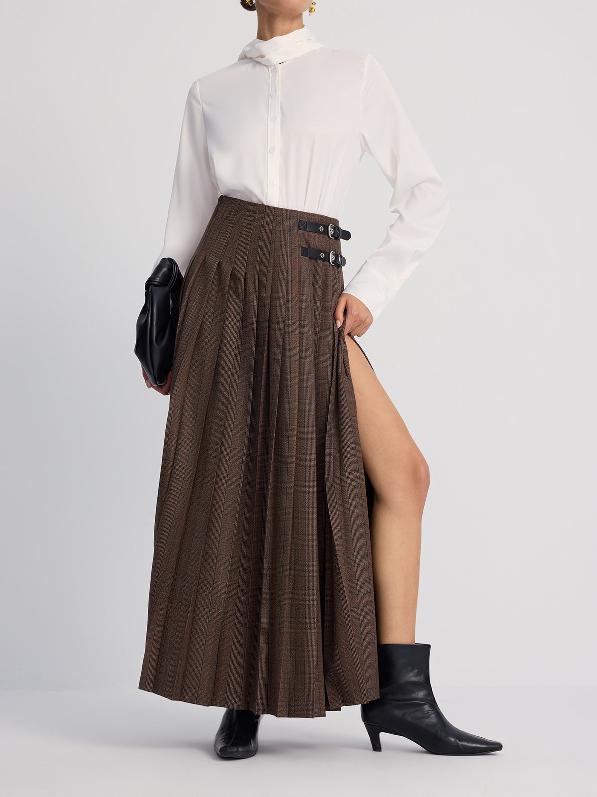 Leather-Buckle Pleated Plaid Maxi Skirt