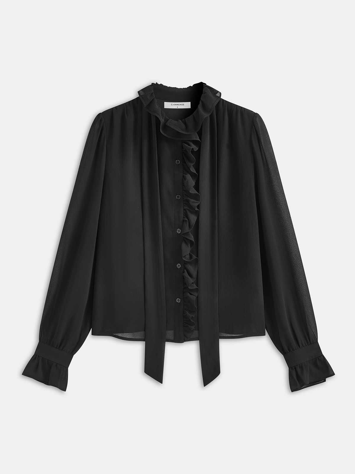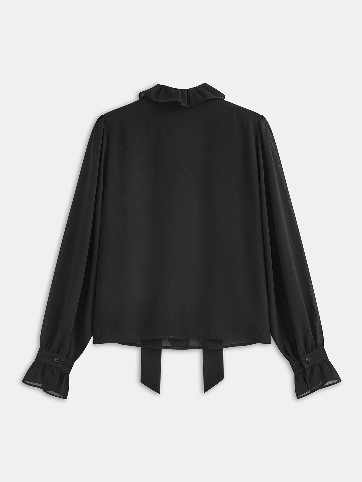 Semi-Sheer Chiffon Ruffle Tie-Neck Top