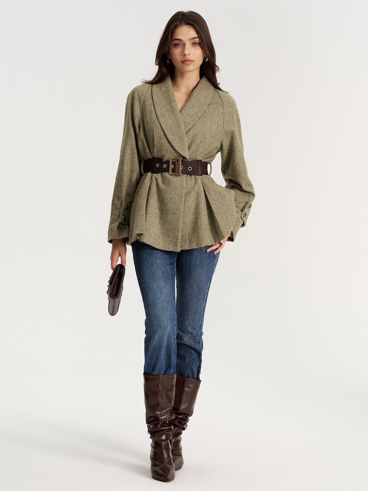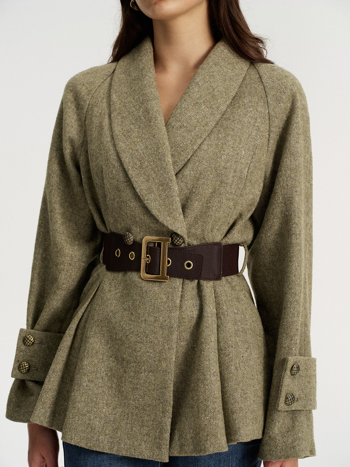 basic - fabric,belted,blazers,clothing,coll:blazers,coll:outerwear,coll:tops,coll:trending,coll:vintage_fabrics,corpcore,date,fall,green,in_six_month,inner sample,long sleeve,metal detail,minegence,non-stretch,not_low_sales,oa250929018,outerwear,photo_model,regular,slim fit,spring,tweed,warm,winter,winter hues,women
