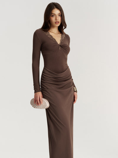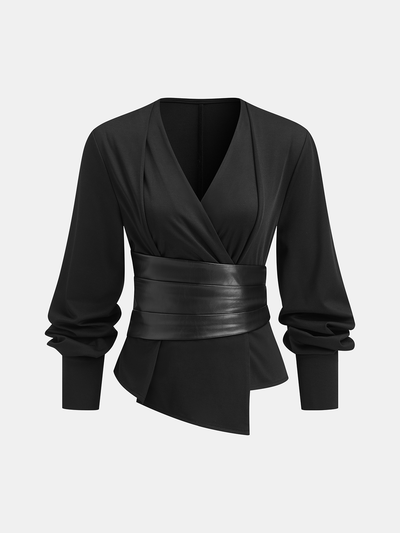 Belted Asymmetric Faux Leather Panel Pleated Maxi Skirt