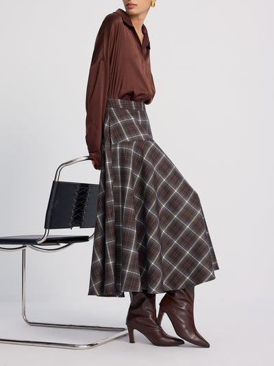 High-Waisted Asymmetric Plaid Midi Skirt