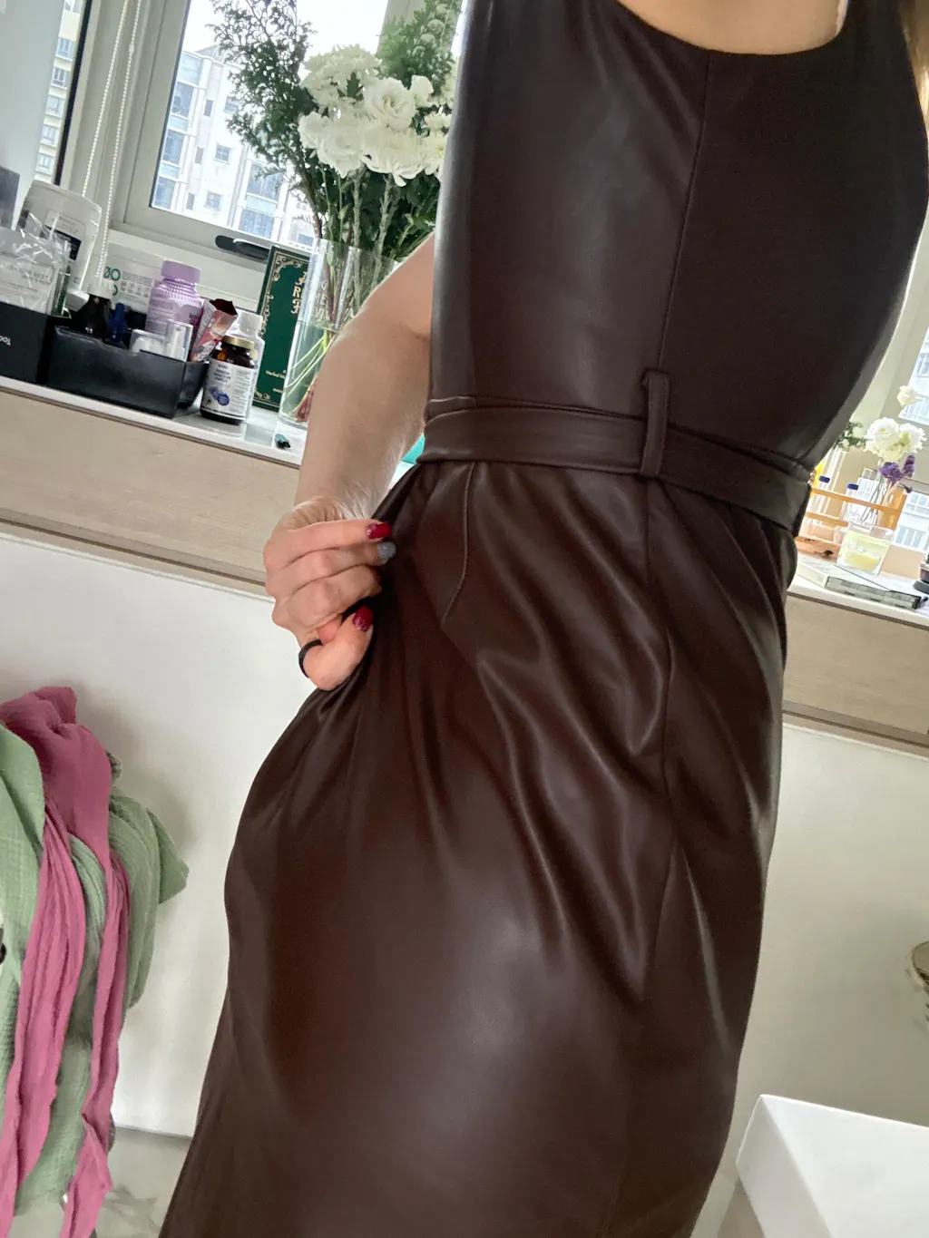 A very nice color, suitable for warm and cool pallets. A bit stretchy with nice back slit. HOWEVER! It is made for rectangular body shape with no waste line. There is a belt coming with the dress, but waste line if the dress and loops for the belt is way too high up creating “preggy” look. It’s look good in breast and hips area, but waist line is disaster. I ask alternation service, and they advice “due to fabric quality no fit in alternation can be done”. Sadly the dress is not accepted for the return either😭😔