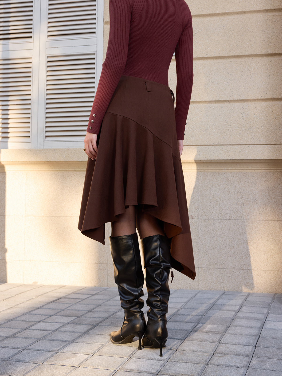 a,a-none,asymmetrical skirt,bottoms,brown,casual,clothing,coll:bottoms,coll:skirts,coll:trending,coll:vintage_fabrics,corpcore,fall,in_six_month,mid waist,midi,minegence,no,not_low_sales,oa251111018,photo_model,regular,regular fit,skirts,slight stretch,spring,suede effect,winter,women