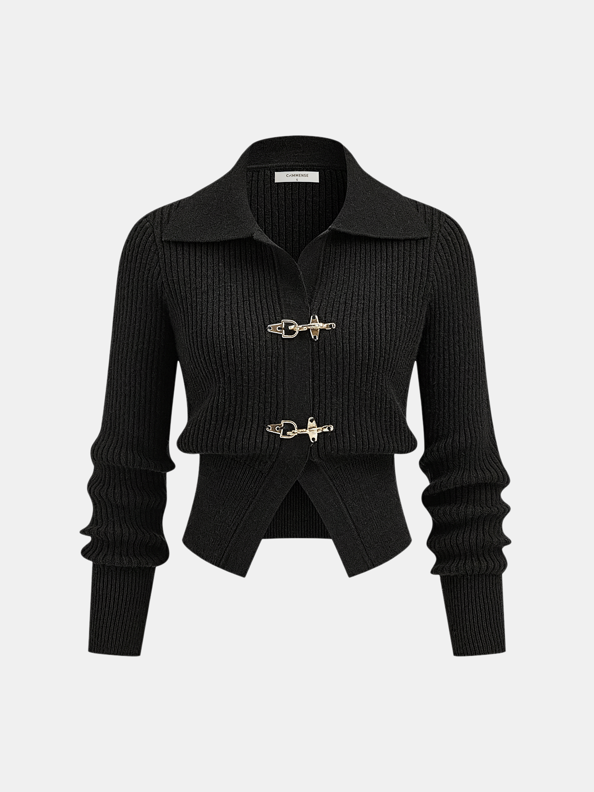 Collared Metal Buckle Ribbed Cropped Cardigan