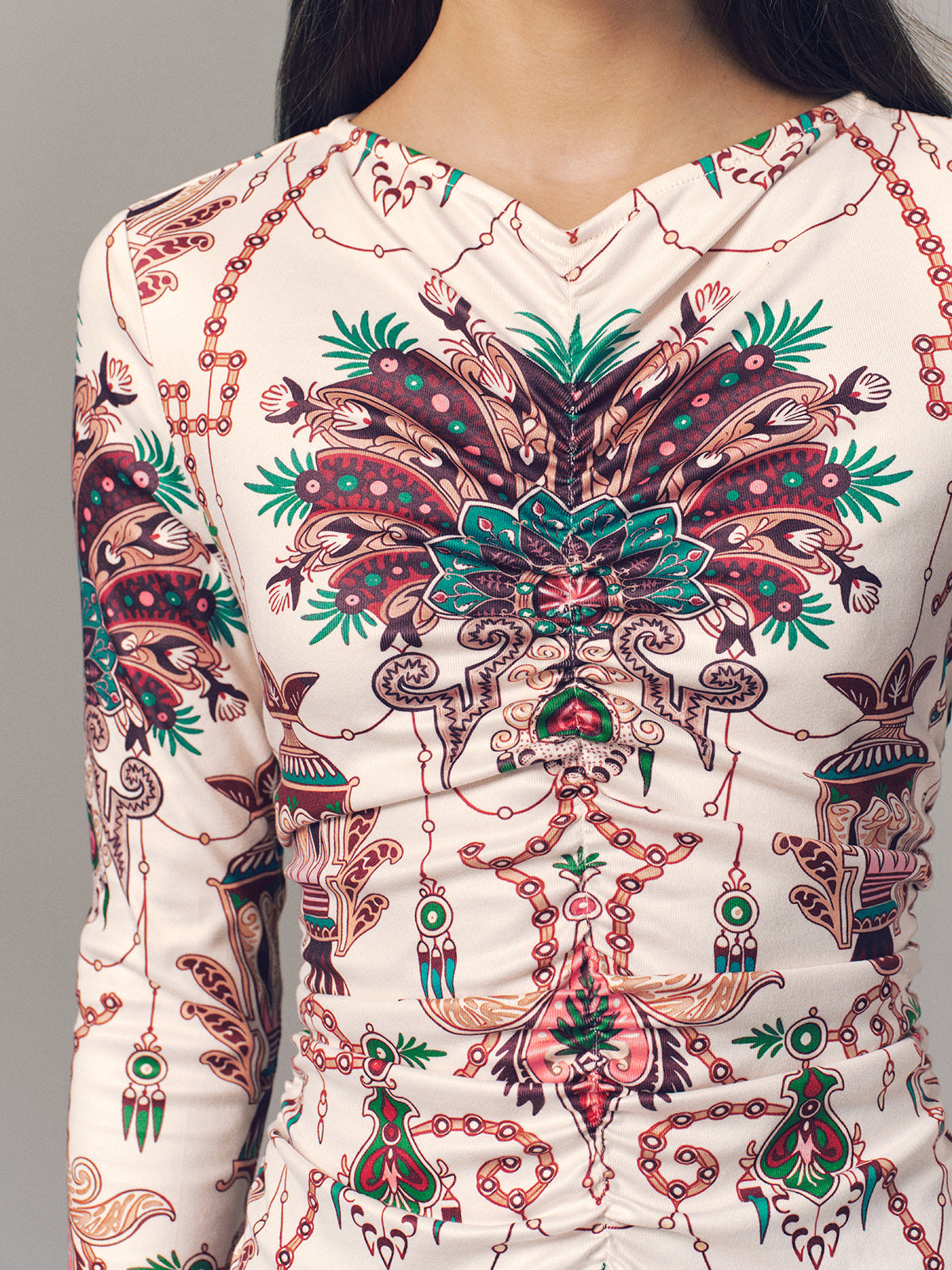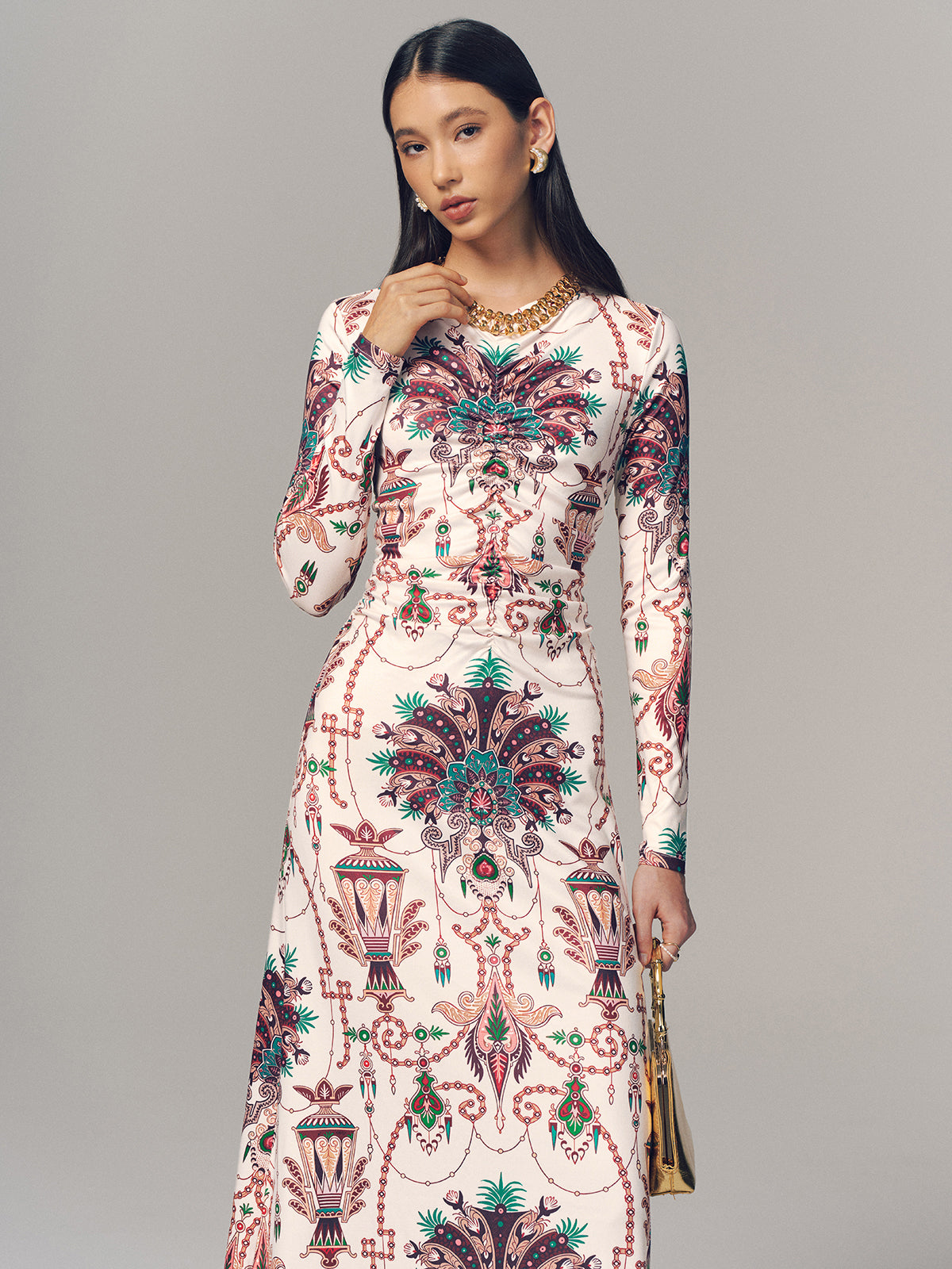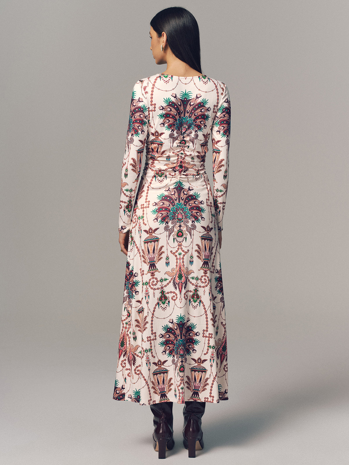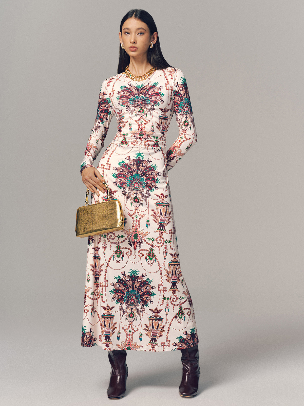 Ruched Printed Long-Sleeve Maxi Dress
