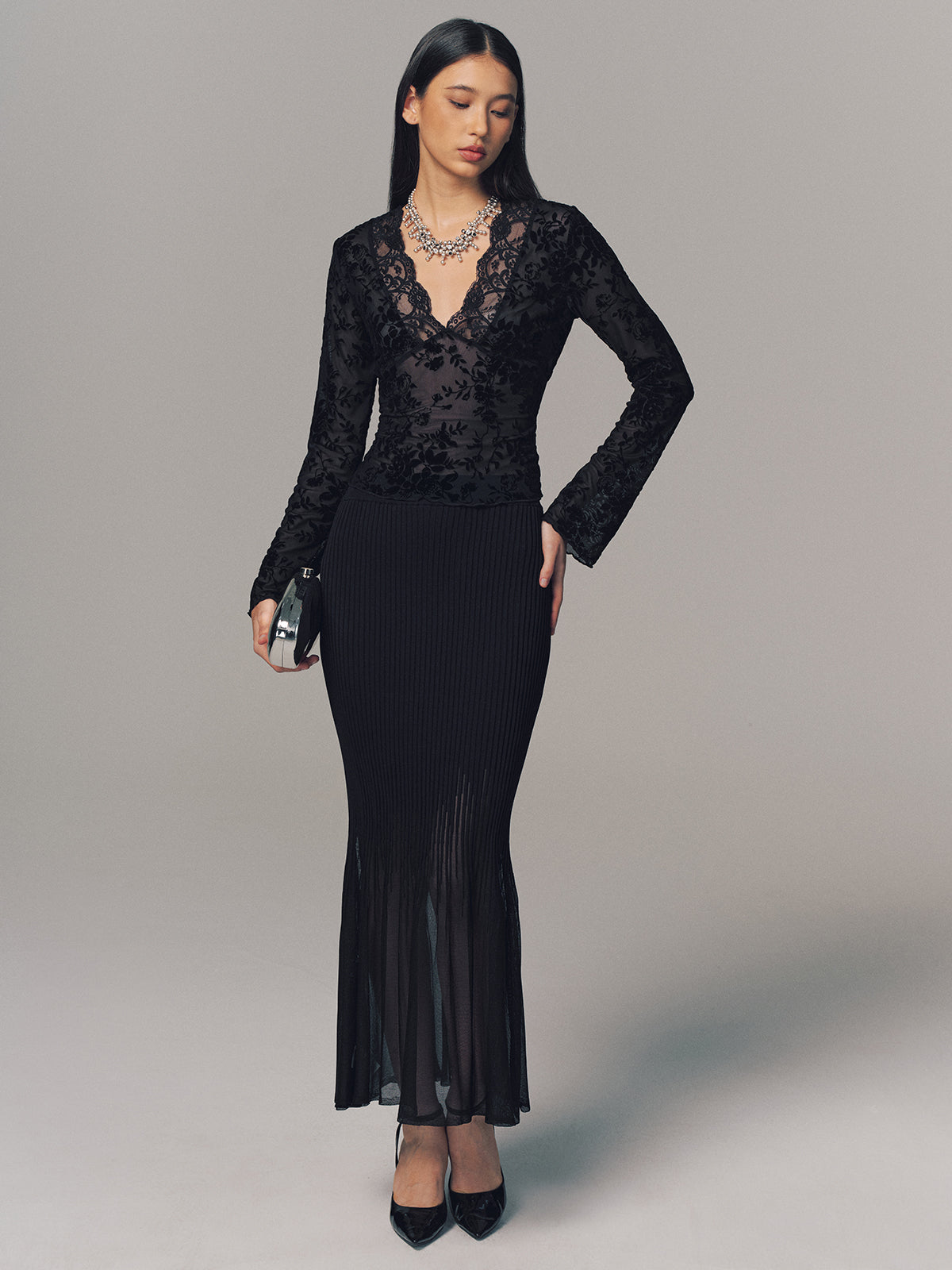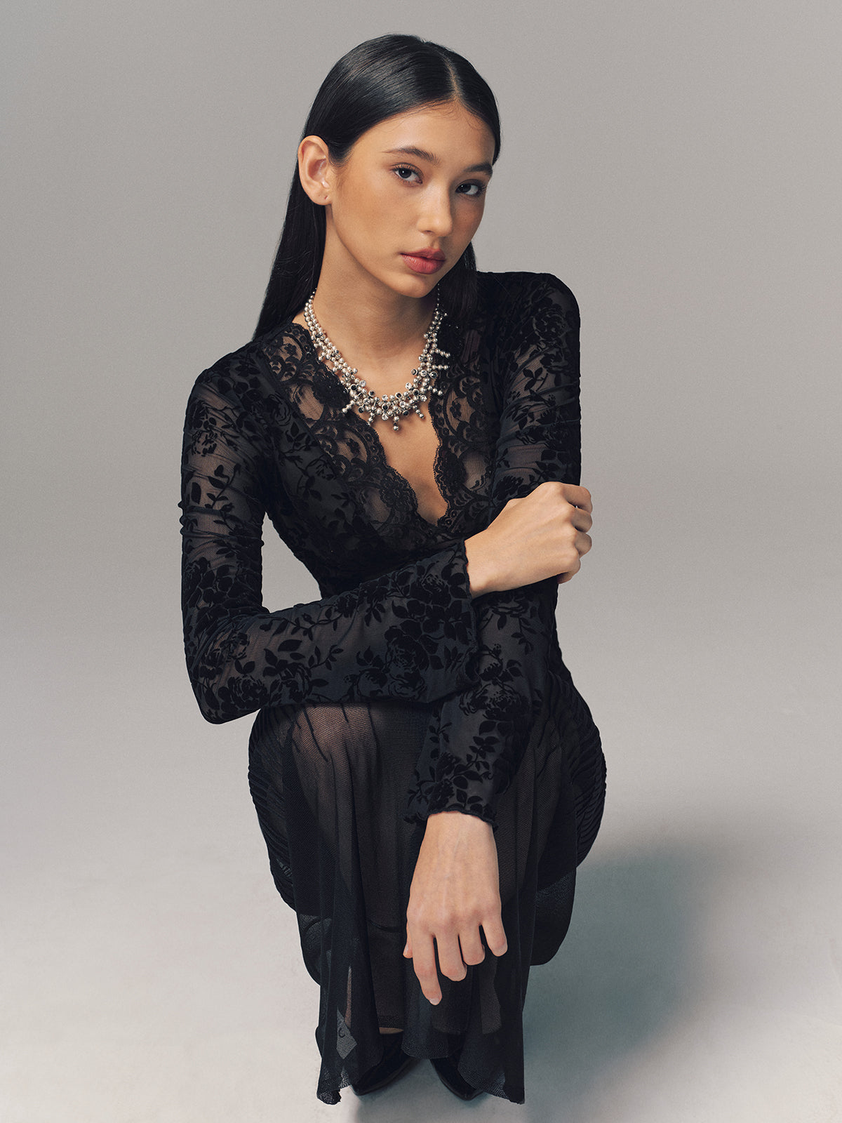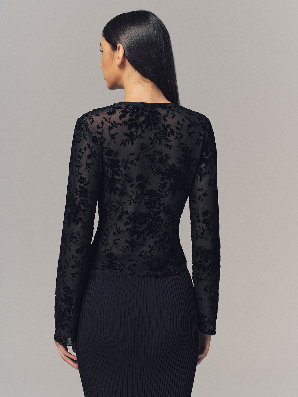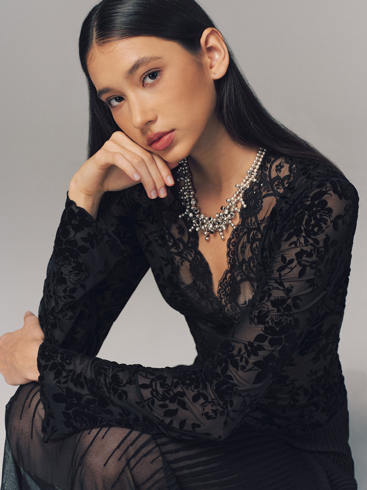 black,blouses,clothing,coll:blouses_shirts,coll:night_glam,coll:sheer_bare-back,coll:tops,date,fall,feminine,in_six_month,lace,long sleeve,medium stretch,not_low_sales,oa251101057,party,photo_model,regular,semi-sheer,sheer,slim fit,spring,thin,tops,v-neck,winter,women