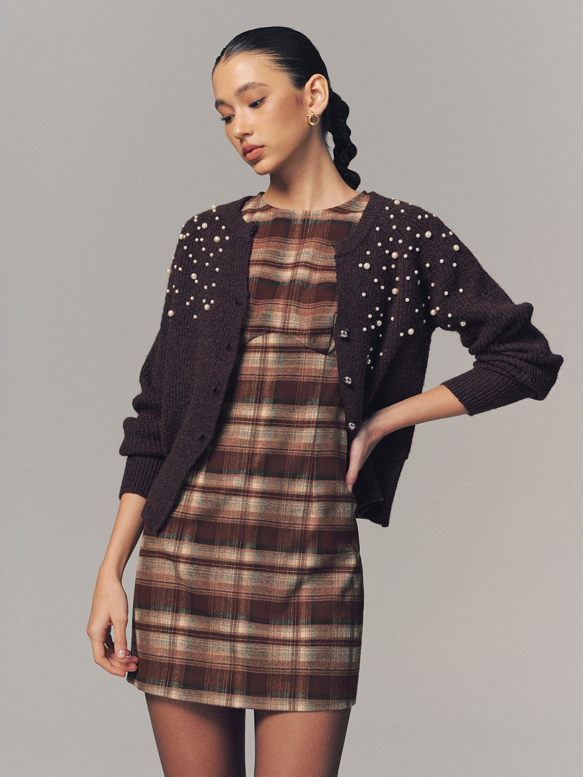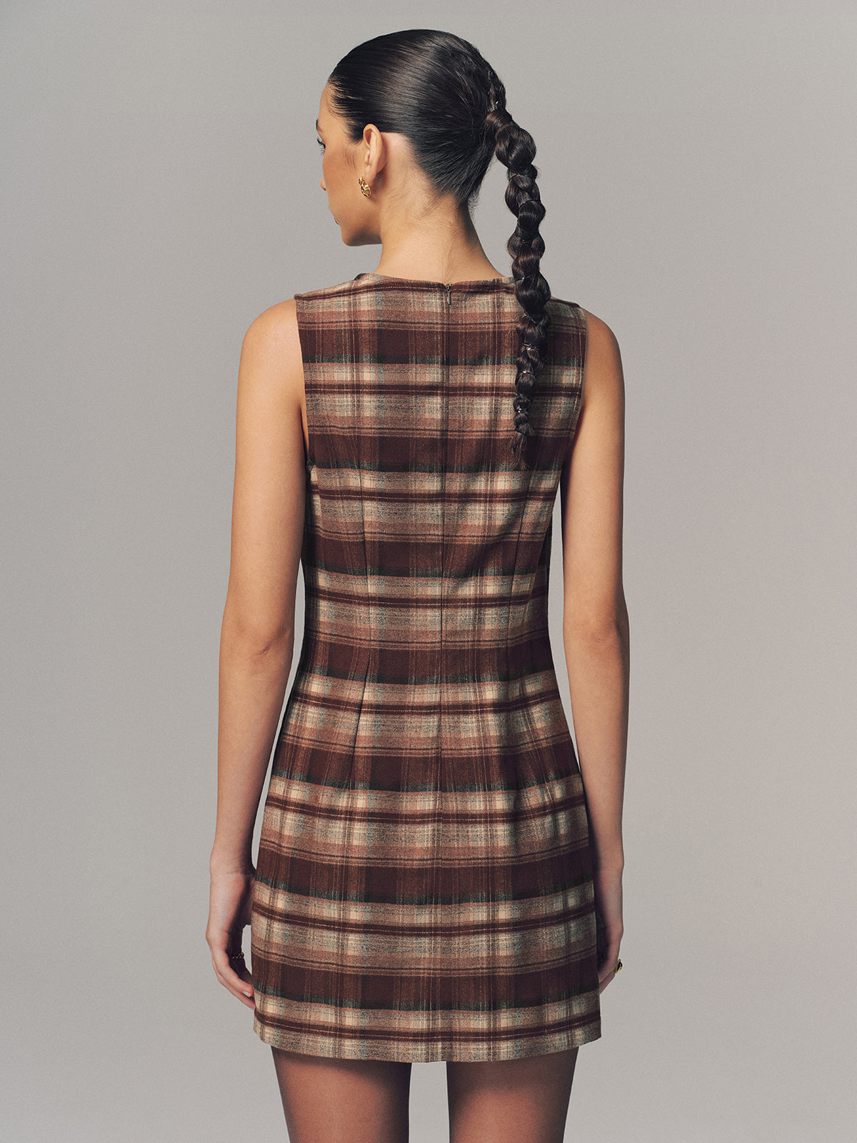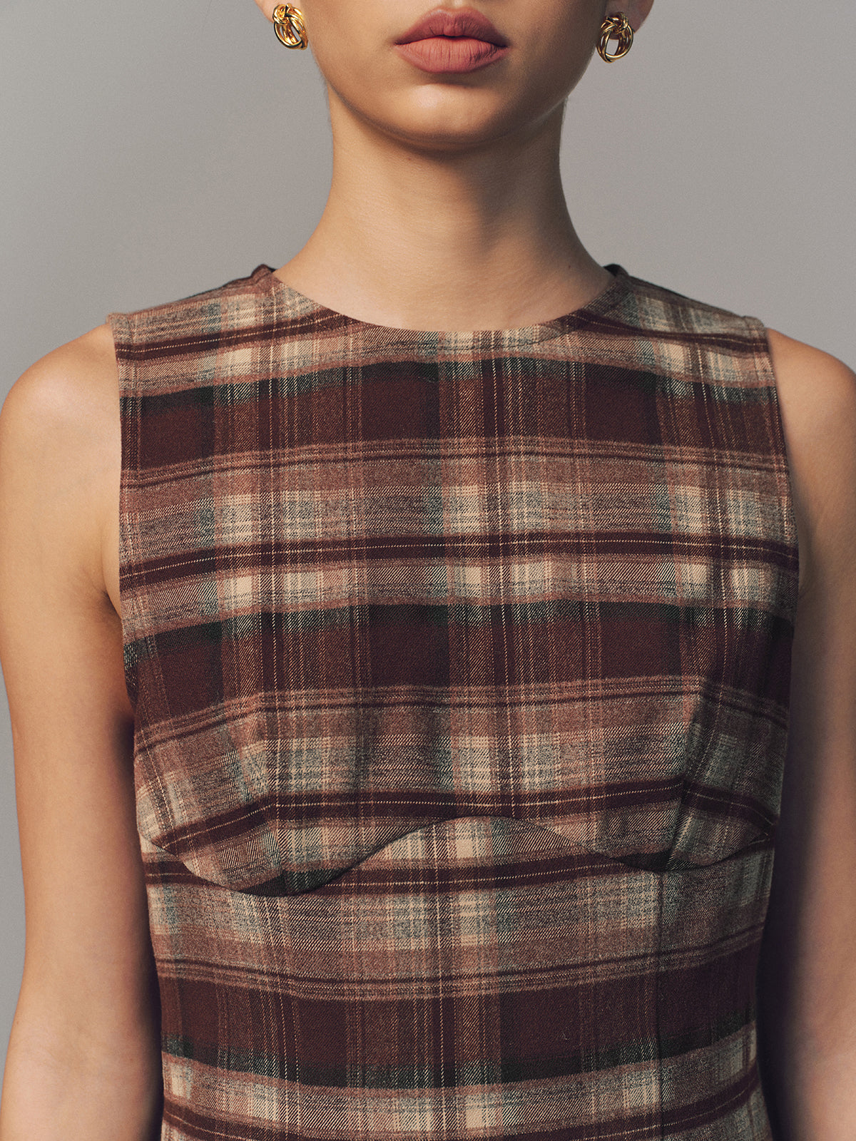 a-none,clothing,coll:dresses,coll:plaids_polka,crew neck,dark brown,dresses,fall,feminine,in_six_month,invisible zipper,no,non-stretch,not_low_sales,oa251010088,photo_model,plaid,regular,short,sleeveless,slim fit,spring,winter,winter hues,women,woven fabric