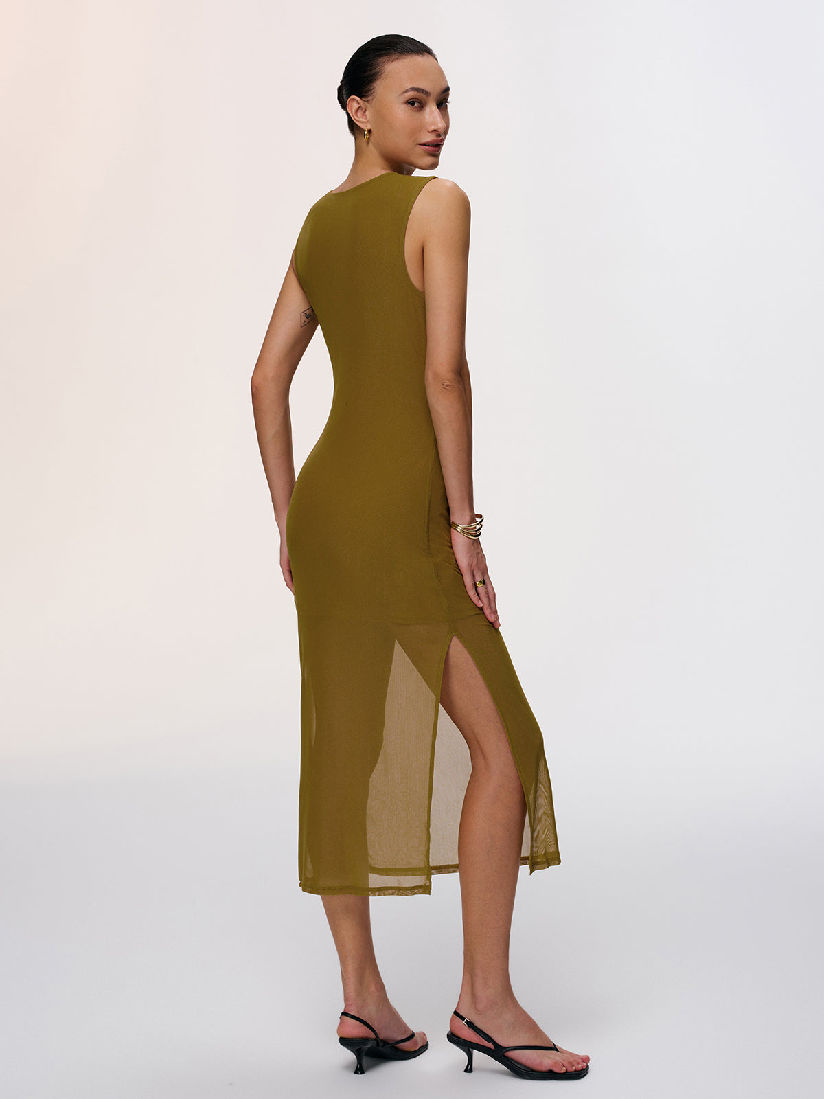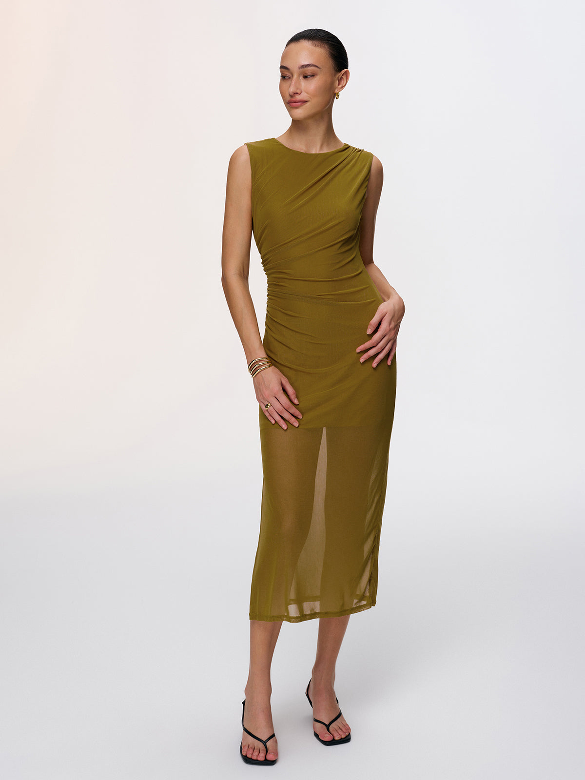 casual,clothing,coll:dresses,crew neck,date,dresses,feminine,green,high stretch,in_six_month,mesh,midi,not_low_sales,oa251204120,photo_model,ruched,semi-sheer,sleeveless,slim fit,summer hues,thin,women