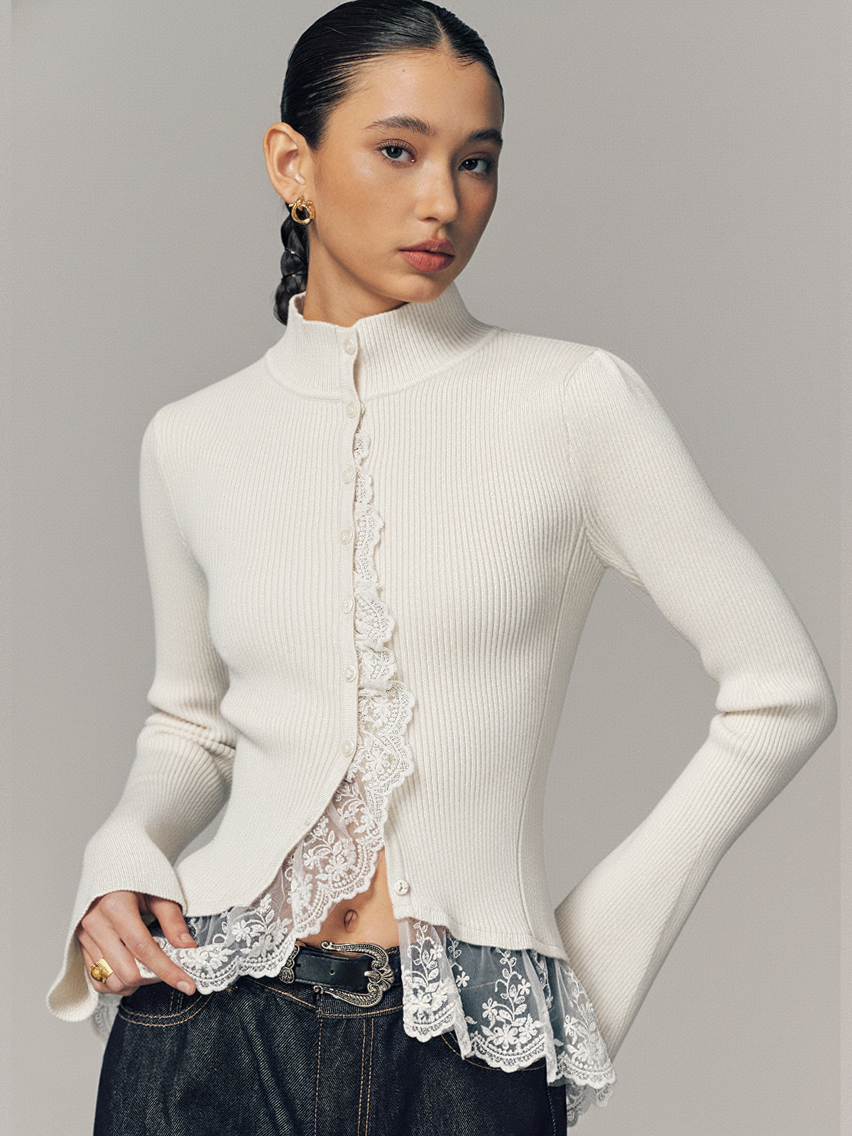Ribbed Mock Neck Lace Trim Cardigan