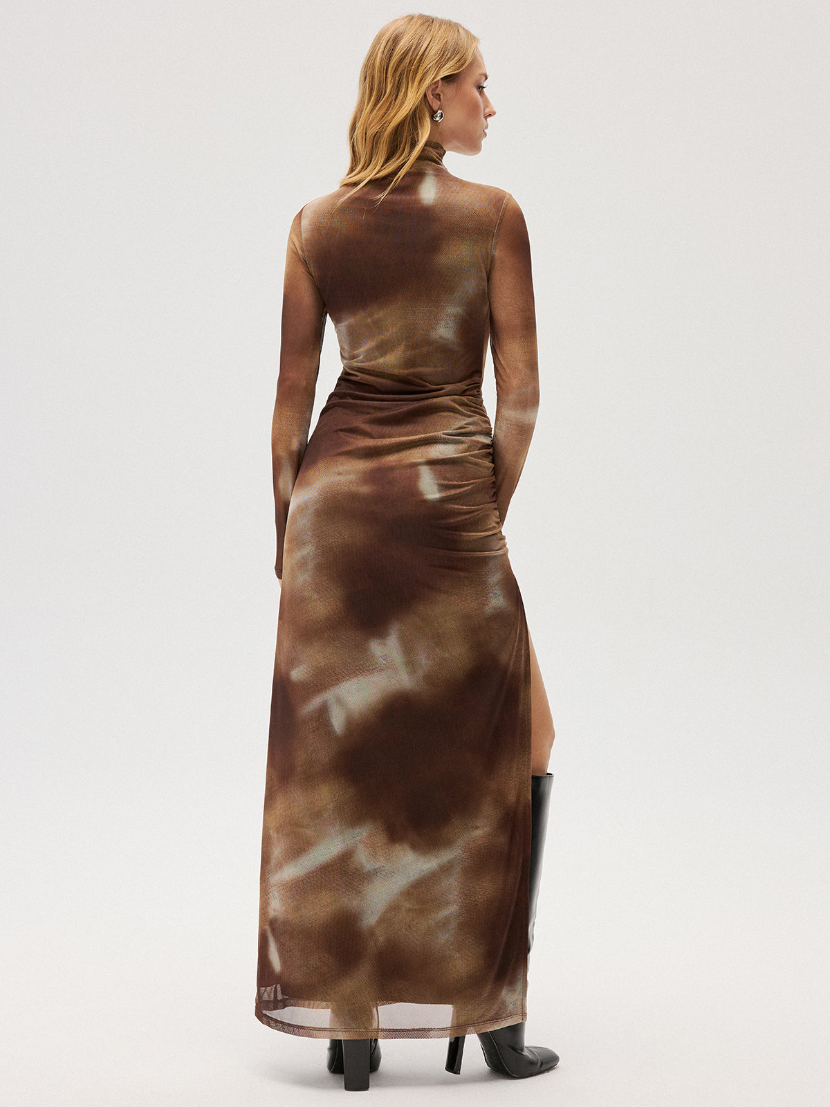 aw pattern,clothing,coll:dresses,coll:night_glam,dark brown,date,dresses,fall,in_six_month,long sleeve,maxi,medium stretch,mesh,minegence,no,not_low_sales,oa251017112,party,photo_model,regular,slim fit,spring,stand collar,winter,winter hues,women