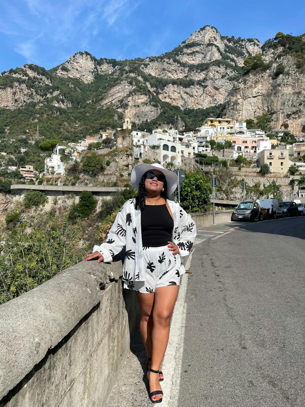 I love this set! I wore it with black strappy heels and it looked super cute! The top is a little oversized but that's what made it cute. I tucked in the front.