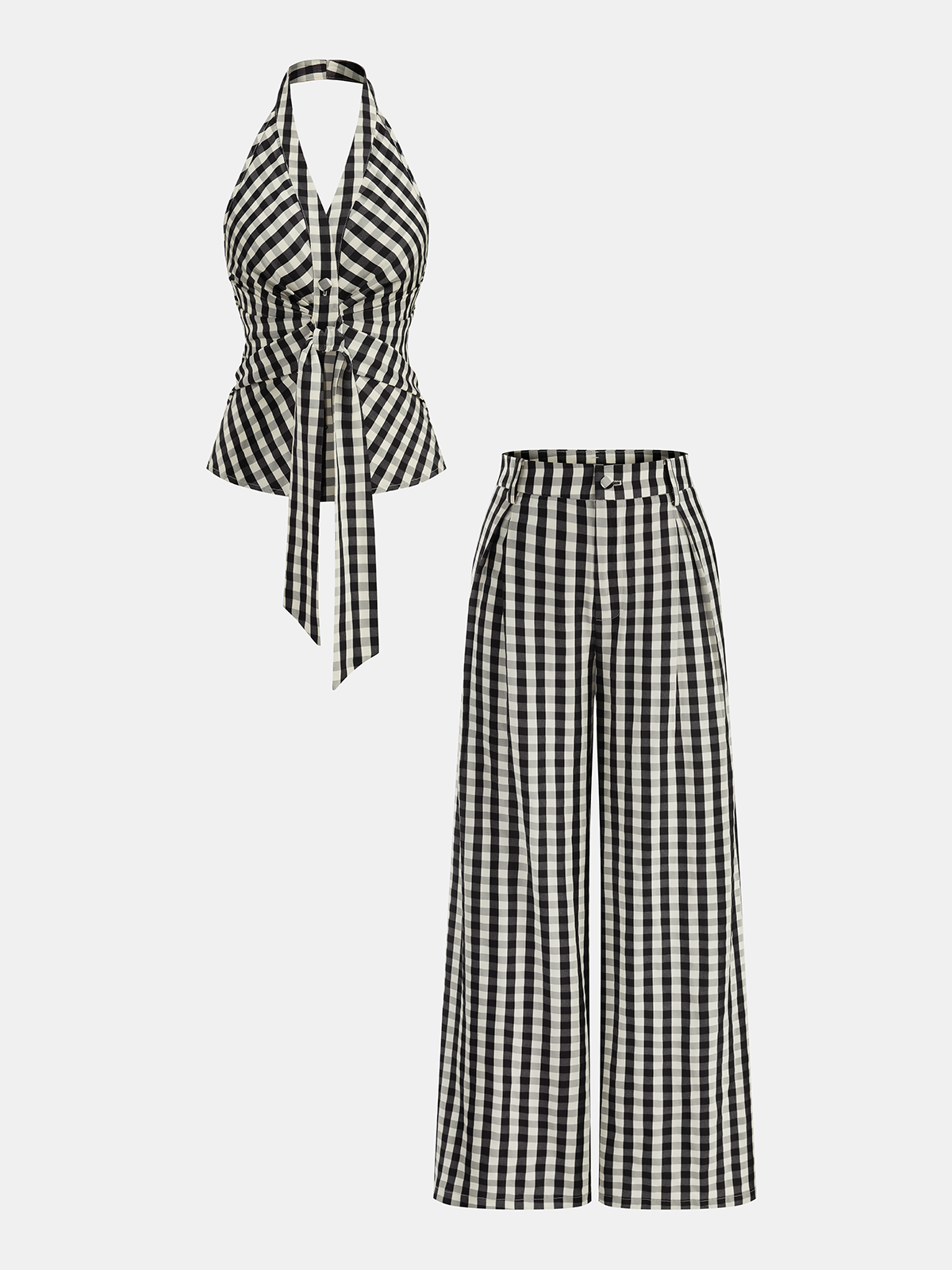 blackandwhite,casual,clothing,coll:linen_cotton,coll:matching_sets,coll:plaids_polka,collarless,corpcore,cotton blends,halter,in_six_month,invisible zipper,long pants,minegence,no,non-stretch,not_low_sales,oa260123016,plaid,regular,regular fit,sets,short sets,sleeveless,tied&knot,women