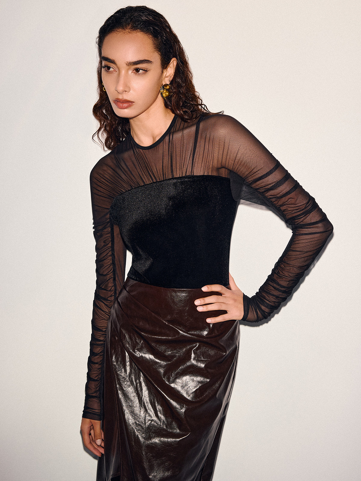 black,blouses,casual,clothing,coll:blouses_shirts,coll:tops,coll:vintage_fabrics,corpcore,crew neck,fall,in_six_month,long sleeve,medium stretch,minegence,not_low_sales,oa250928020,patchwork,photo_model,regular,regular fit,semi-sheer,tops,velvet,winter,women