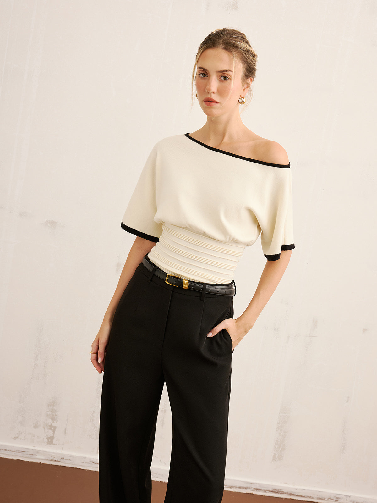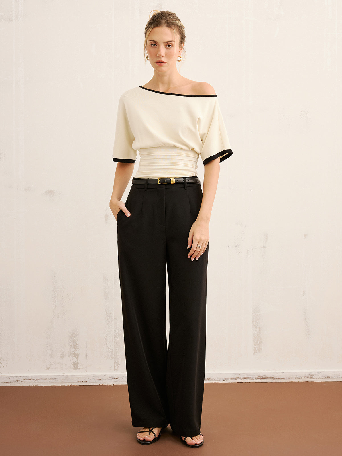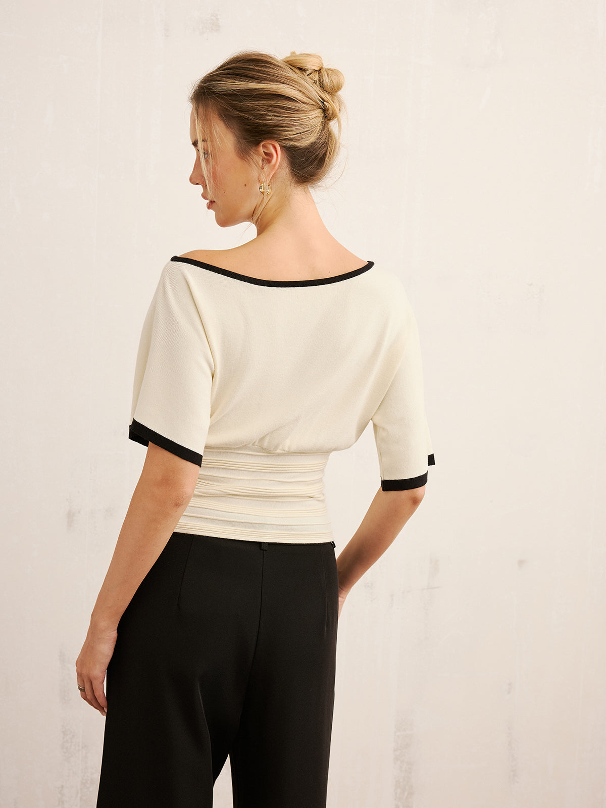 Contrast Trim Cinched Waist Knit Top