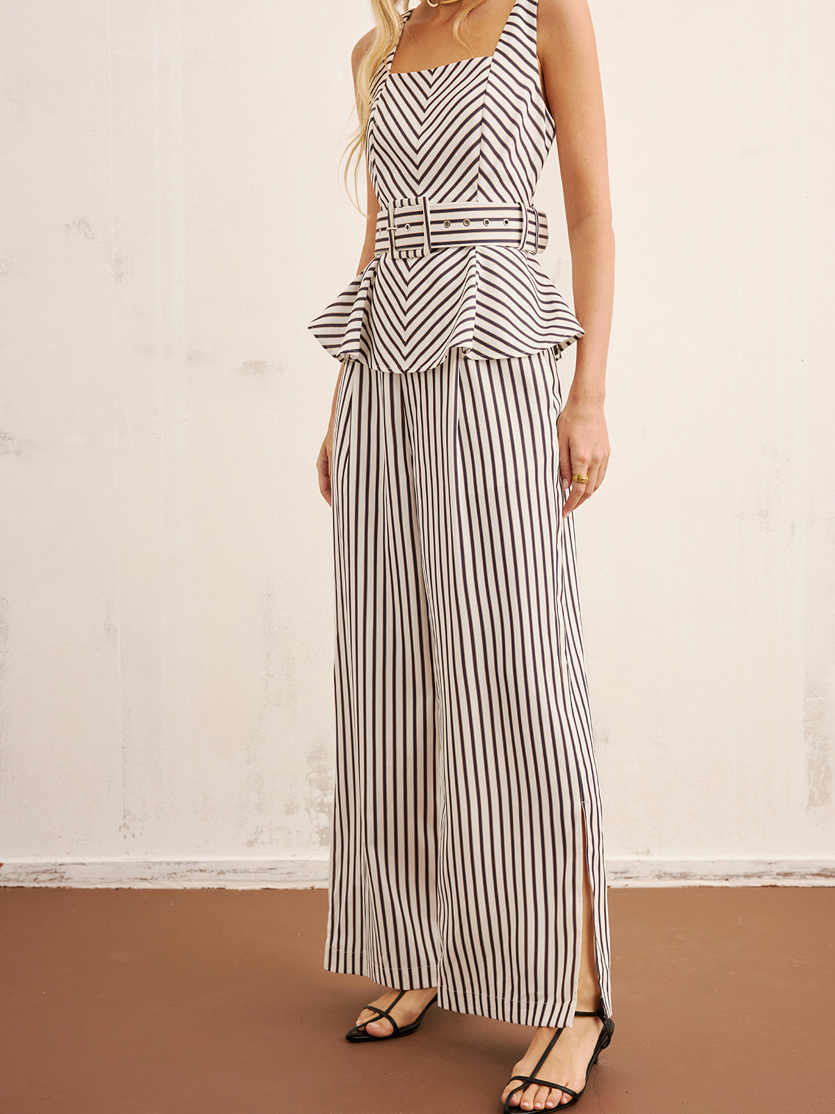 belted,blackandwhite,casual,clothing,coll:bottoms,coll:matching_sets,corpcore,elastic waistband,in_six_month,minegence,modern minimal,no,not_low_sales,oa251128069,pant sets,peplum,photo_model,regular,regular fit,sets,slight stretch,stripe,women,woven fabric