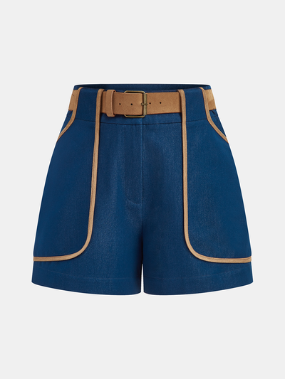 Jacquard Trim PU Leather Mini Skirt with Belt