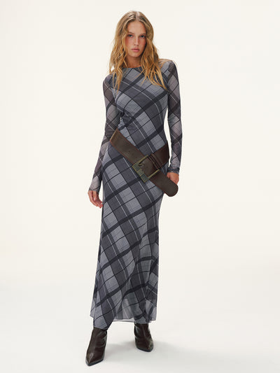 Plaid Mesh Long Sleeve Maxi Dress without Belt