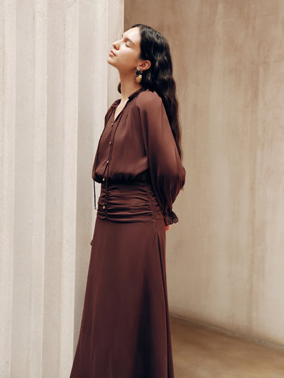 Ruffled Hem Button Front V-Neck Maxi Dress