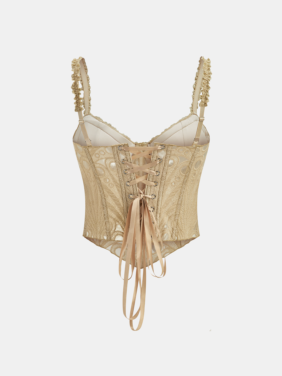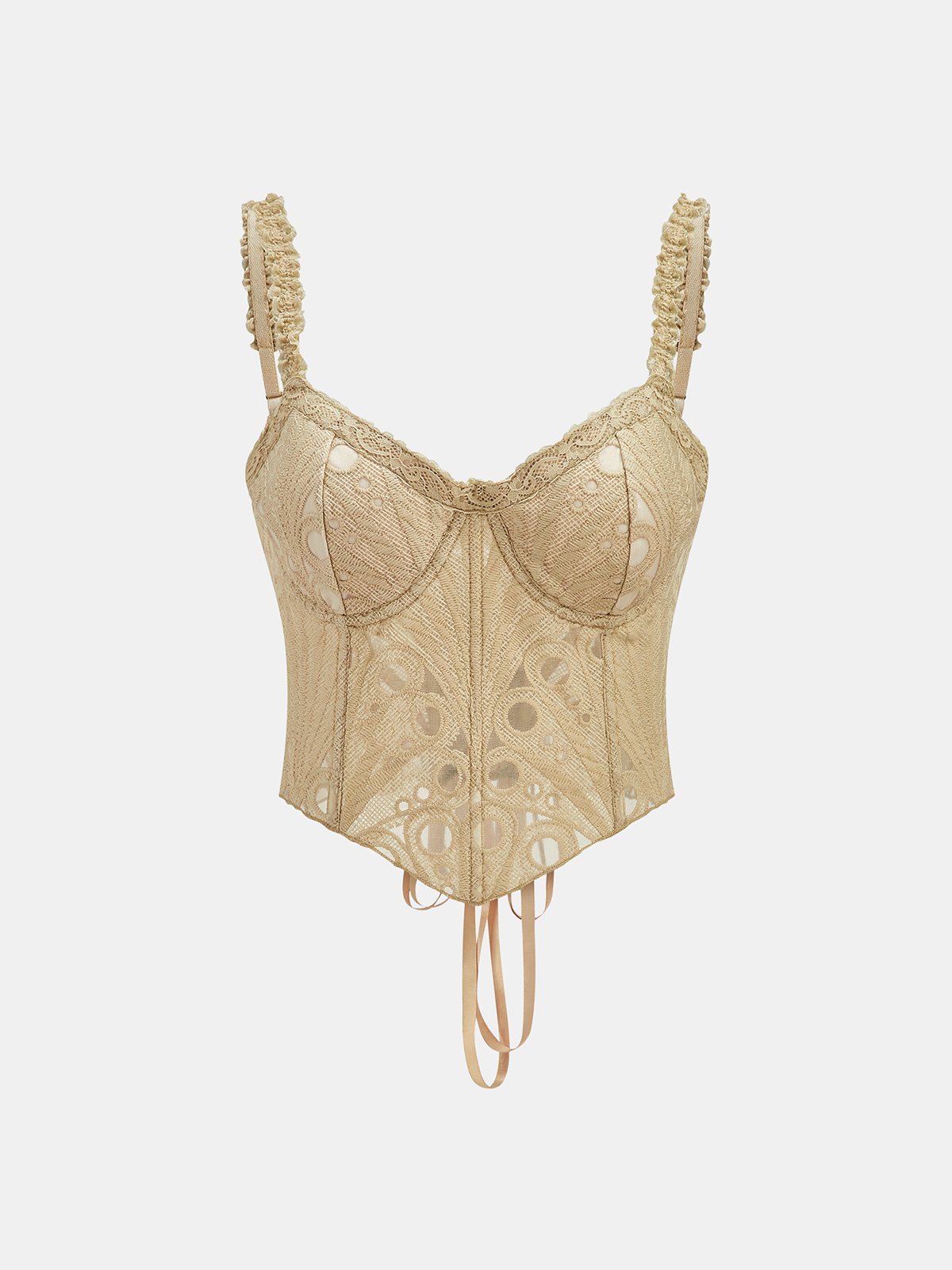 clothing,coll:night_glam,coll:sheer_bare-back,coll:tops,collarless,corset,date,feminine,in_six_month,khaki,lace,non-stretch,not_low_sales,oa260121004,party,regular,ribbon detail,semi-sheer,sheer,short top,sleeveless,slim fit,tops,women,woven fabric