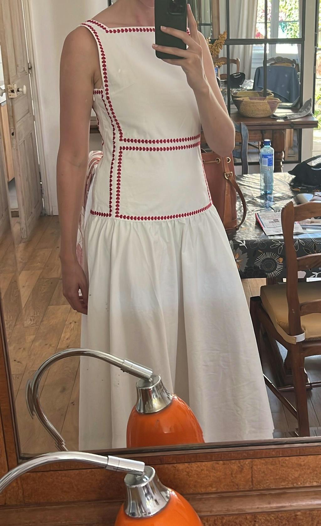 Gorgeous dress! Amazing, weighty fabric so it hangs well, adorable red edges. Didn’t realize the little red dots are actually hearts - so cute! Nice length for a tall girl