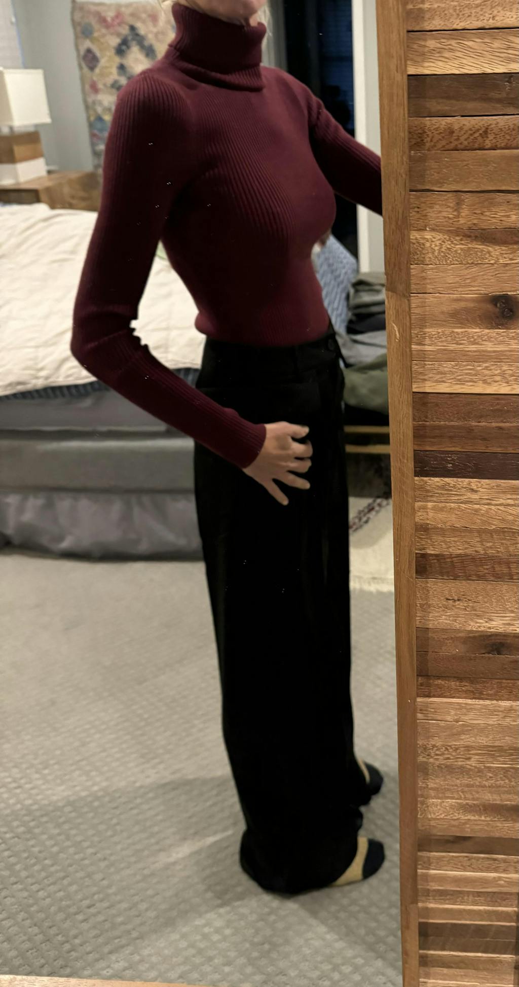 I love love love this neck! It is thicker, a beautiful shade of burgundy, and the sleeves are long enough for me. I am 5’9 and 110lbs so it’s hard to find shirts that are not crop tops and have sleeves that are long enough, this fit the bill! I will most likely be ordering other colors because it is so flattering.