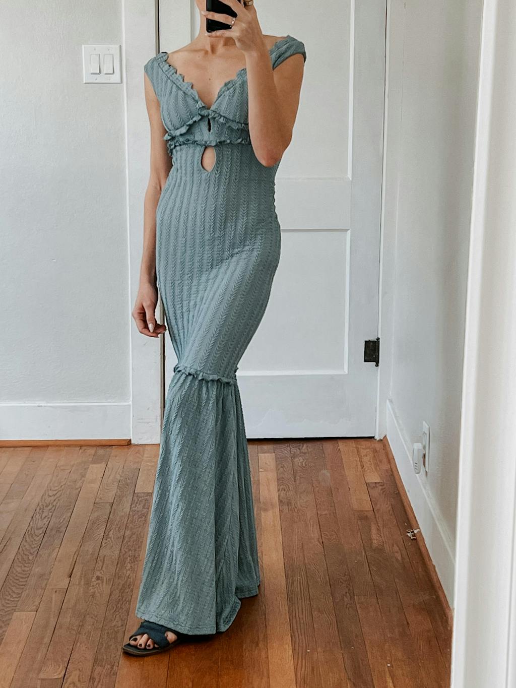 Cuter in photos than irl. I fell in love with the look of this dress and want to like it but despite trying to convince myself, I don't. I've never actually worn it no matter how many times I put it on with intent to. It may work for some people, but it doesn't for me and here's why - despite the cocktail cut/design and price, the material gives it a very cheap/casual look in person; the bust area is double lined and conservatively cut for an off shoulder, completely covering me up/generally making me look flat despite being a 32C wearing an XS, while the single-lined mid thru hip section is entirely see-thru, showing both the outline of every nude thong cut and material ever (i've tried it all) and totally unflattering on my stomach which has never been an issue for me. And finally, the material is strangely heavy and super stretchy, meaning, despite the length looking right when first putting it on, as I walk and move it sags lower and lower to the ground making the middle section even more see-through and the length too long (I'm 5'6"). Really wish I would've just returned it.