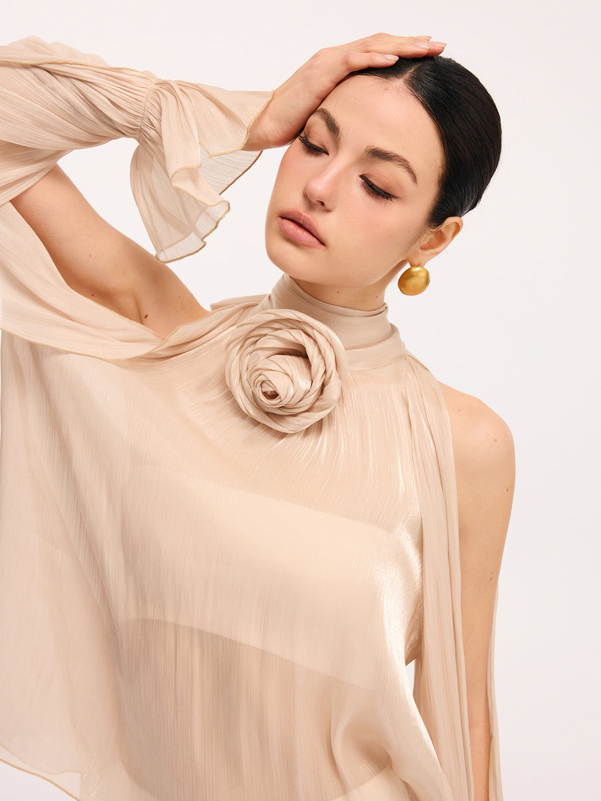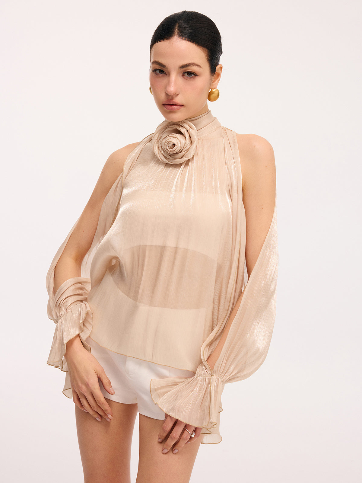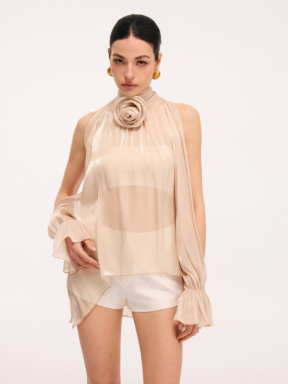 3D Rose Halter Neck Bell Sleeve Sheer Blouse