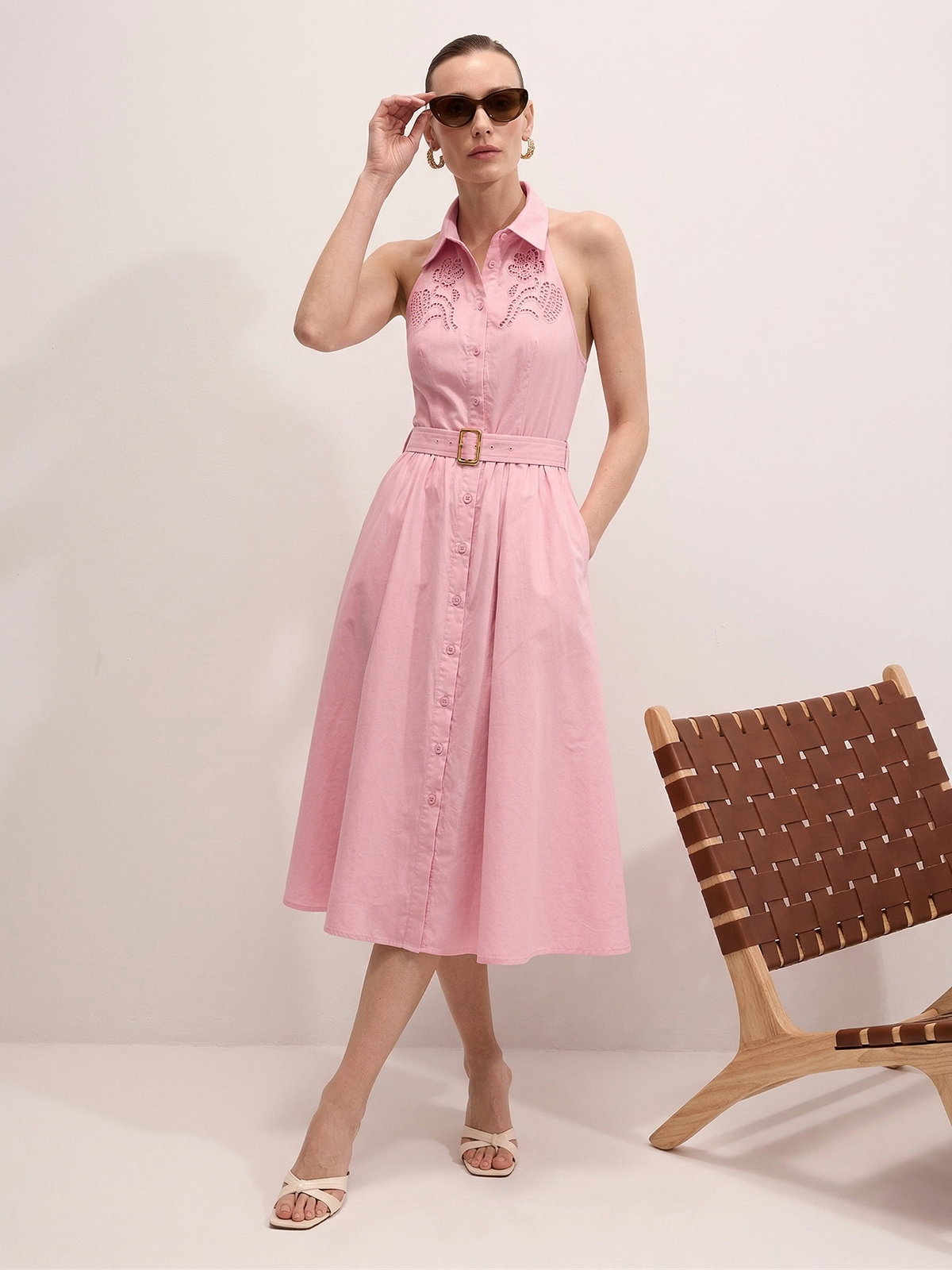 Cotton Embroidered Belted Halter Maxi Dress