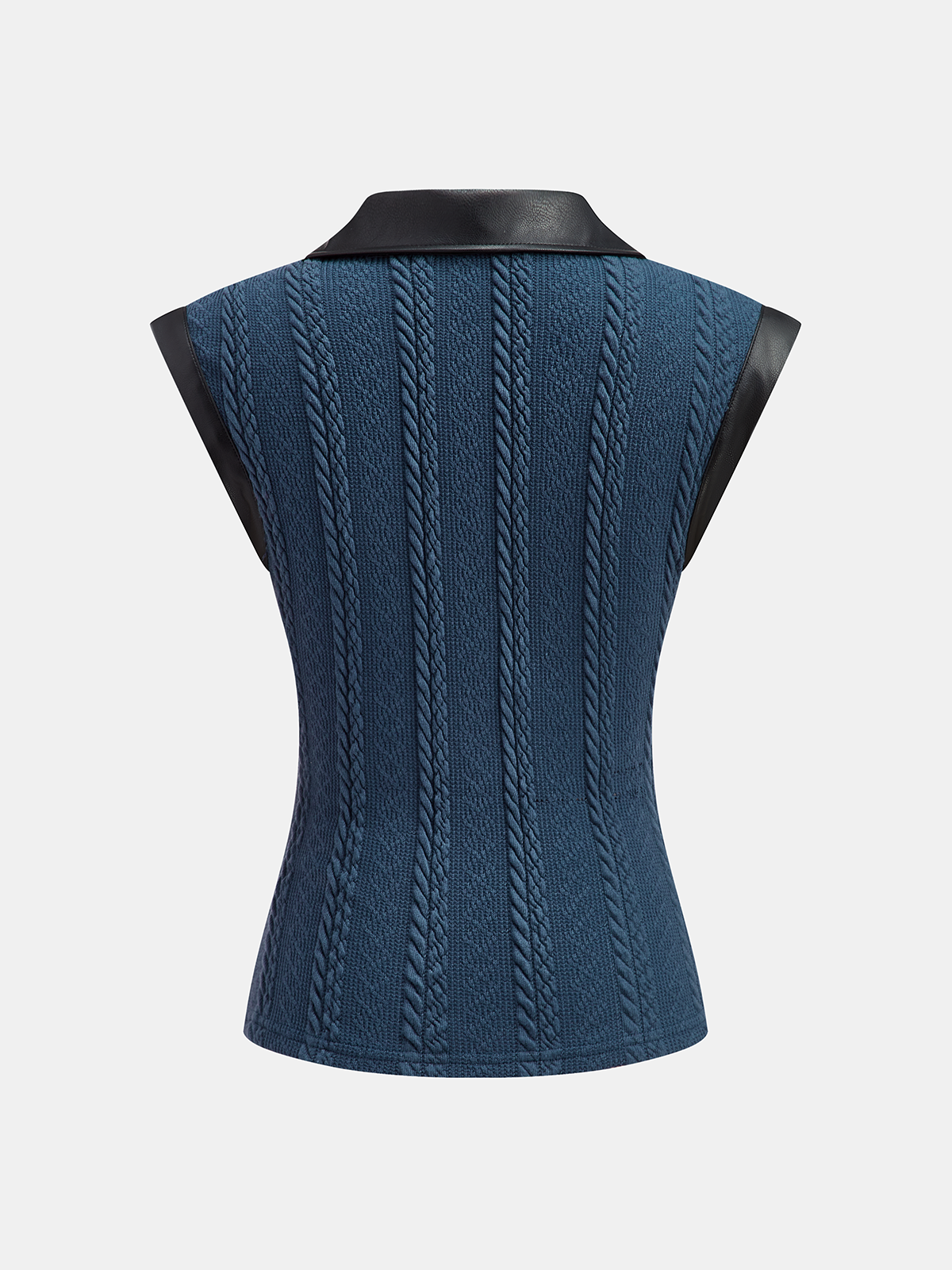 Faux Leather Panel Cable Knit Sleeveless Polo Top