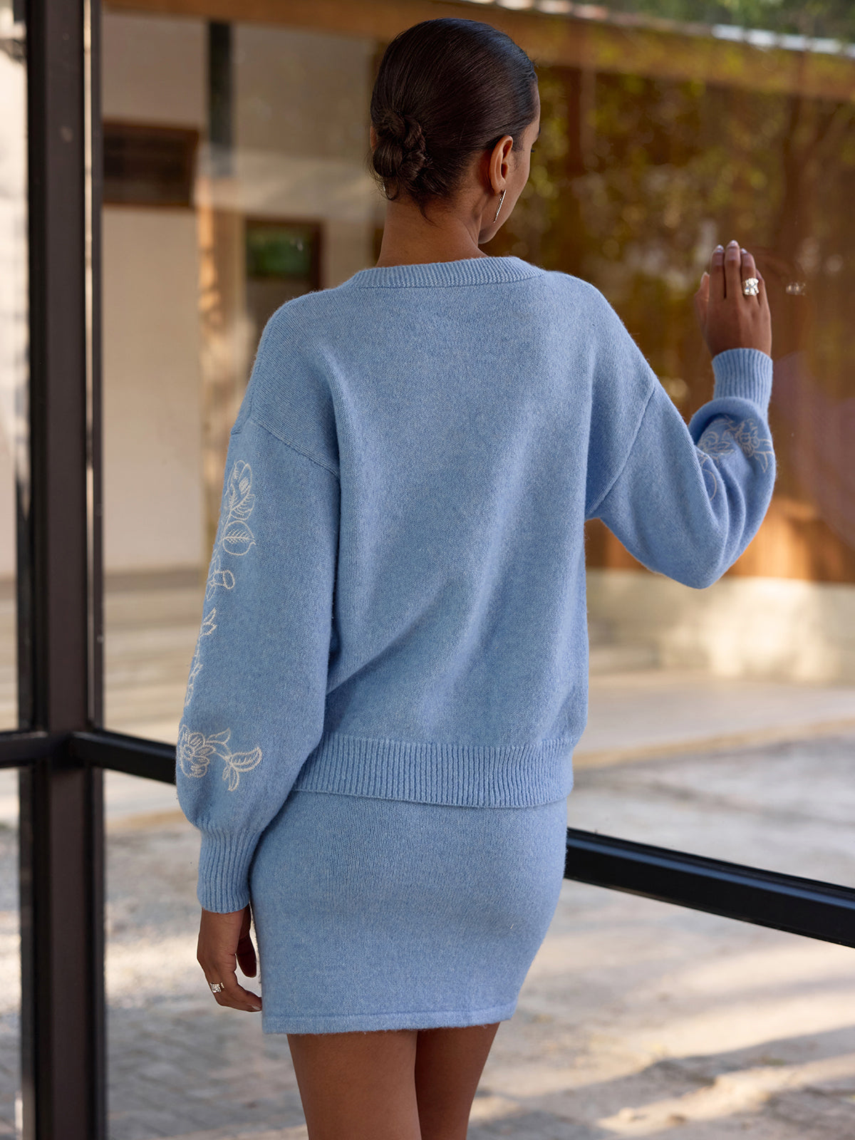 Floral-Embroidered Knit Cardigan & Mini Skirt Set