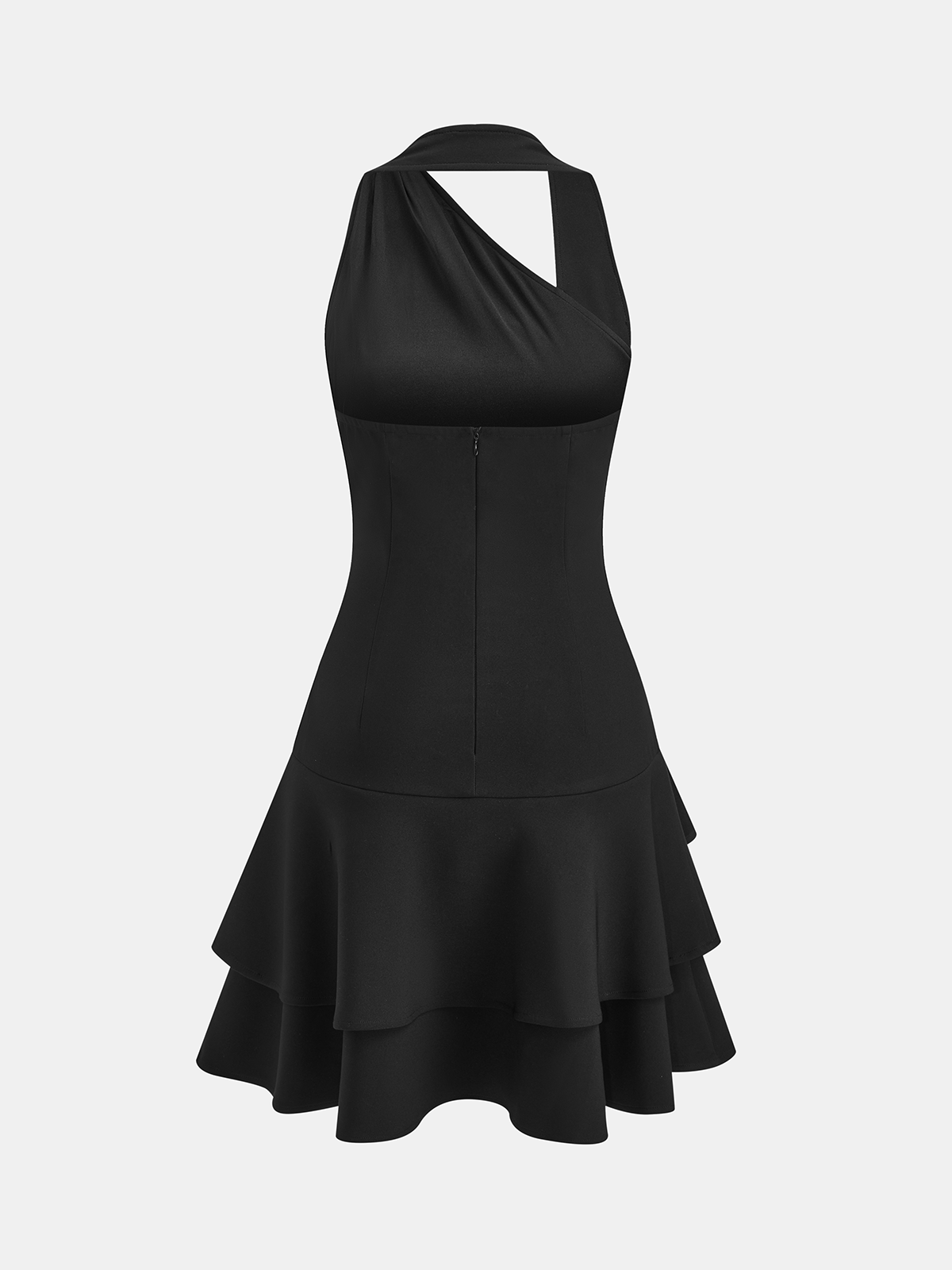 asymmetric,asymmetrical neck,black,casual,clothing,coll:dresses,coll:vacation,coll:weekend_getaway,dresses,feminine,in_six_month,invisible zipper,no,not_low_sales,oa260205029,pleated,regular fit,ruffle,short,sleeveless,slight stretch,thin,vacation,women,woven fabric