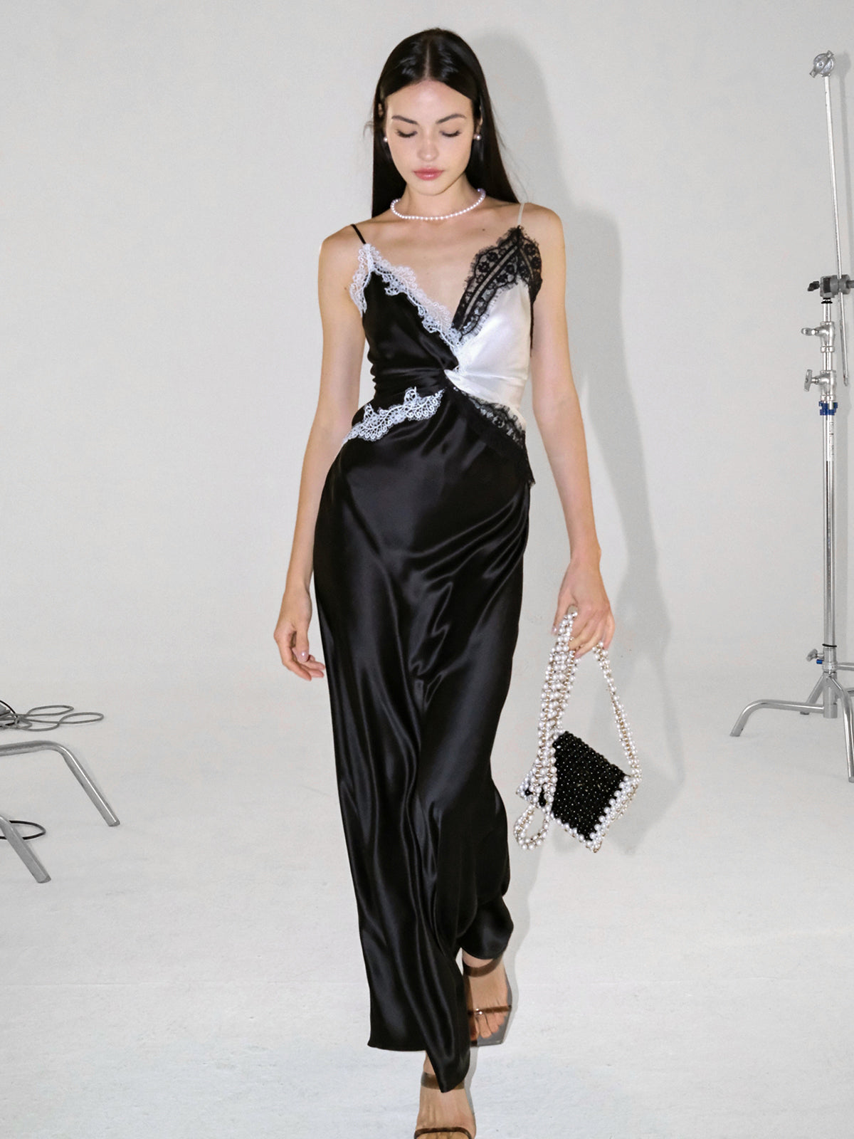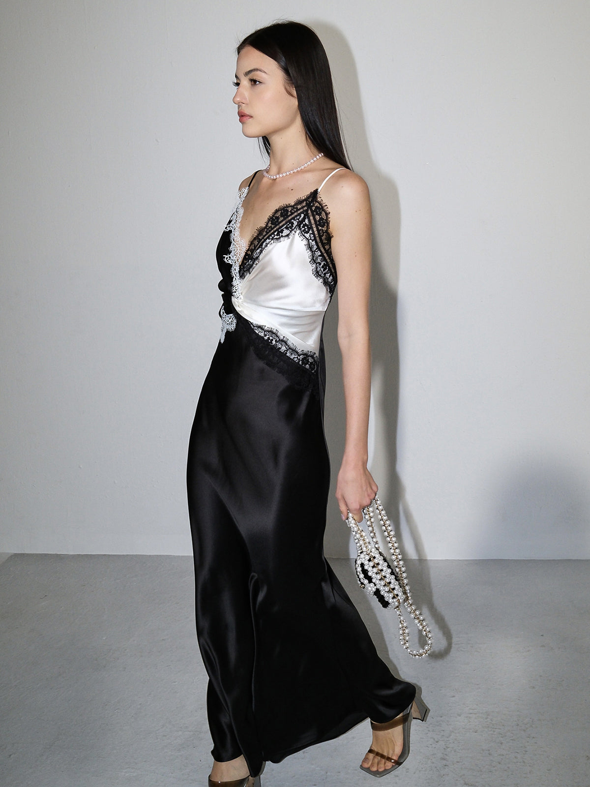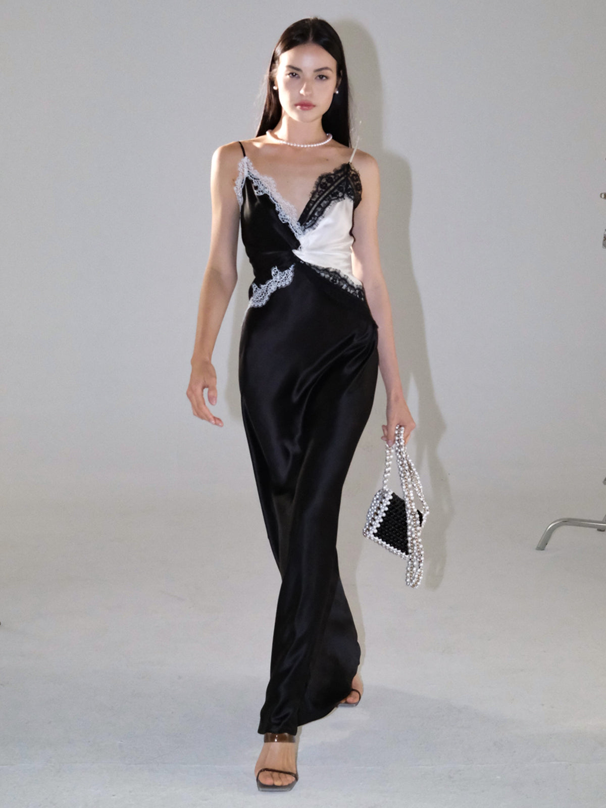 adjustable straps,blackandwhite,clothing,coll:dresses,coll:night_glam,contrast piping / trim,date,dresses,fall,feminine,in_six_month,inner sample,lace,maxi,no,non-stretch,not_low_sales,oa251022060,party,photo_net,regular,regular fit,satin,sleeveless,spring,summer,v-neck,winter,women