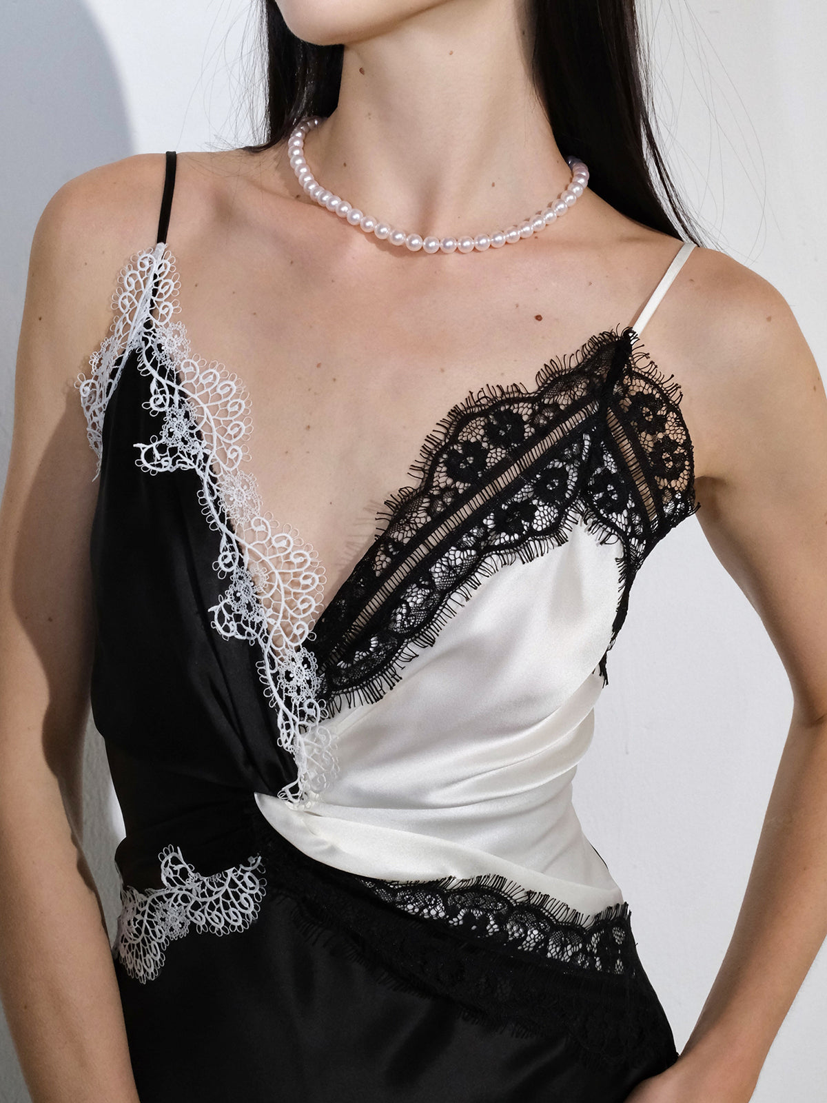 Lace Detail Backless Two-Tone Satin Cami Dress