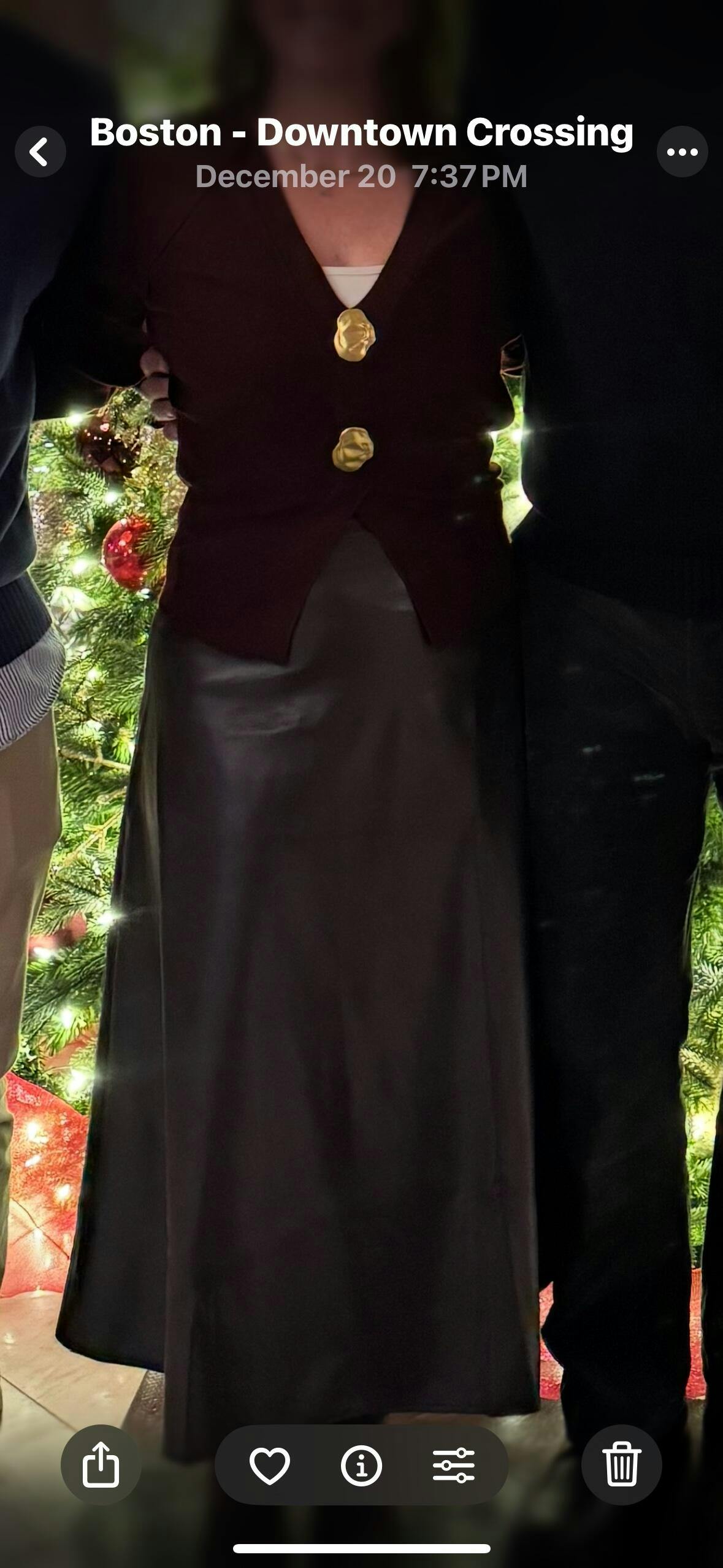 Beautiful sweater and the gold buttons is what makes the sweater beautiful. Material is soft. The V-neck is low, but I wore with a tank top.