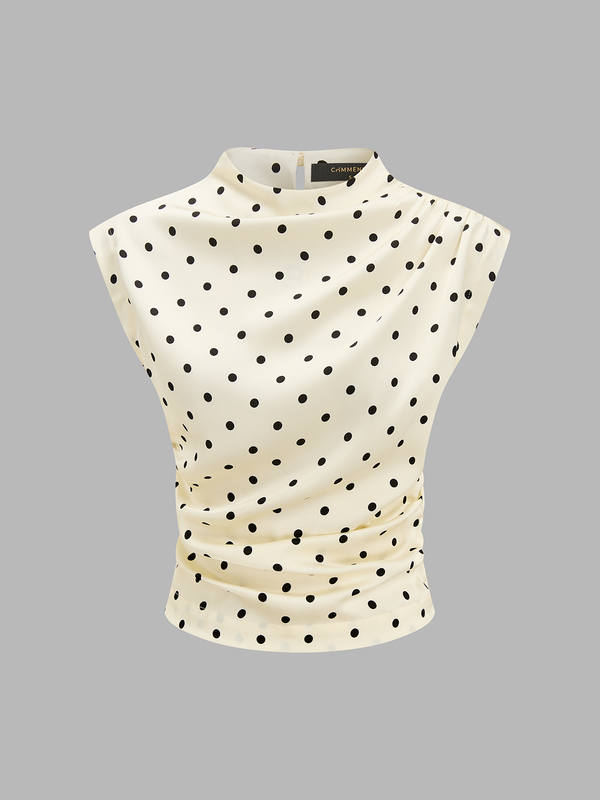 blouses,casual,clothing,coll:blouses_shirts,coll:tops,corpcore,in_six_month,minegence,no,non-stretch,not_low_sales,oa260320029,off-white,polka dot,regular,regular fit,ruched,satin,sleeveless,stand collar,tops,women